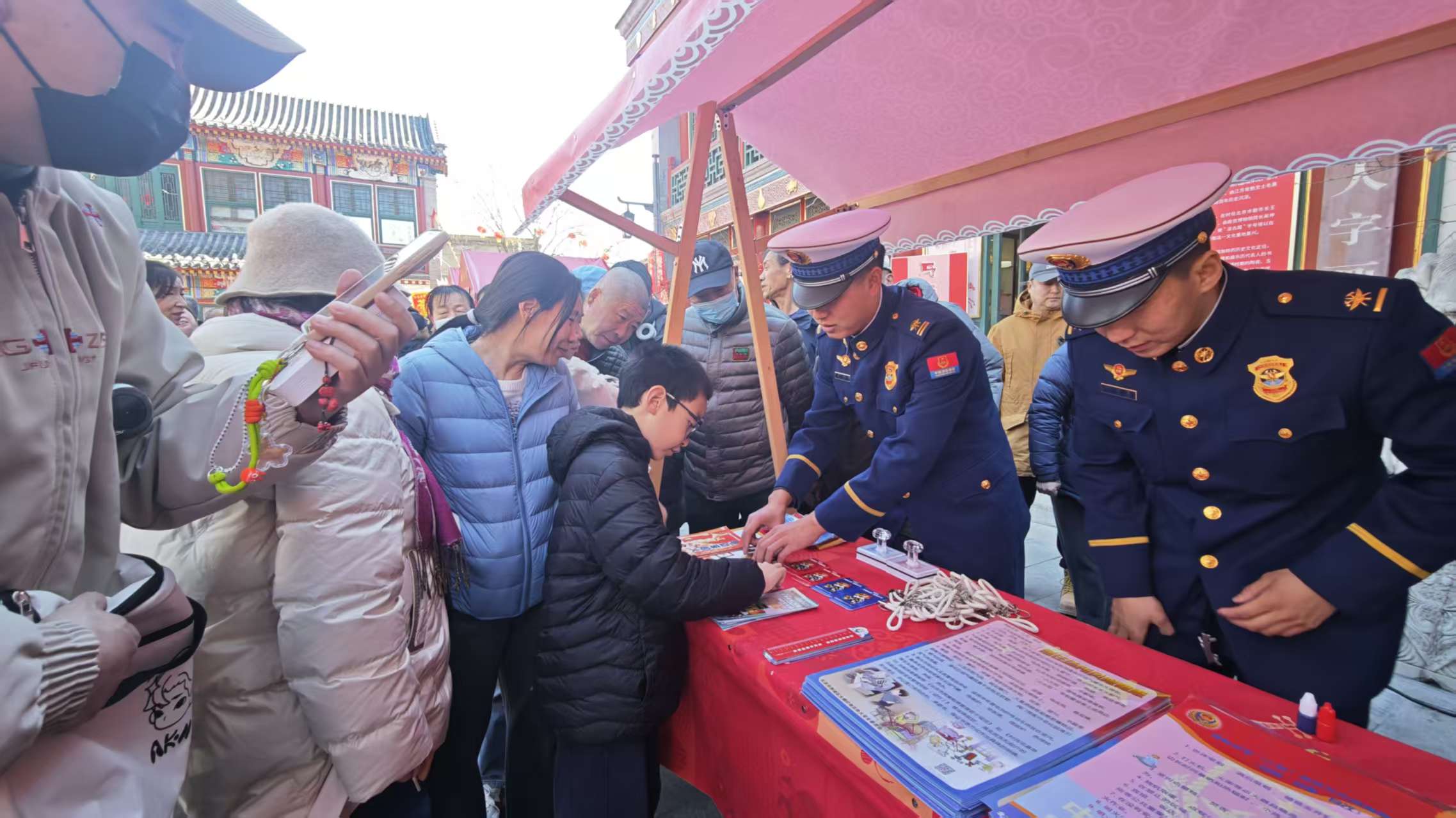 在厂甸庙会,设在中国书店门前广场的宣传摊位人潮涌动,互动气氛热烈,市民游客积极热情参与到特别设计的消防主题猜灯谜活动中,在猜谜过程中既收获了乐趣,也记住了消防常识。