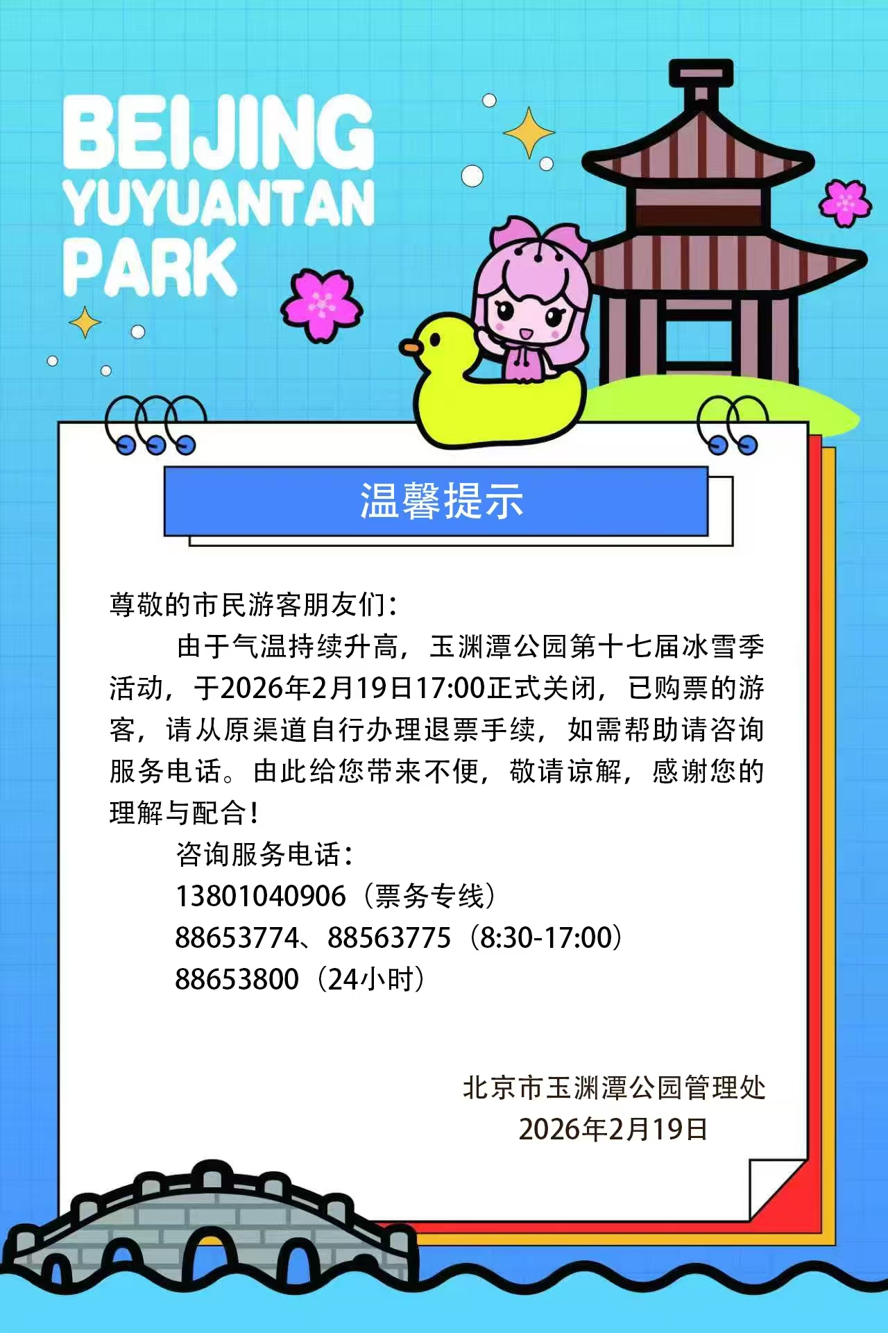 玉渊潭公园发布温馨提示:由于气温持续升高,玉渊潭公园第十七届冰雪季活动于2026年2月19日17:00正式关闭,已购票的游客,请从原渠道自行办理退票手续,如需帮助请咨询服务电话。