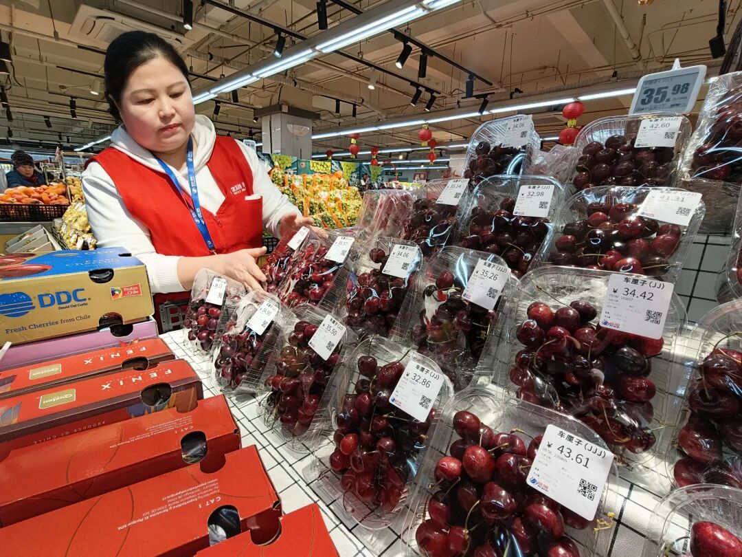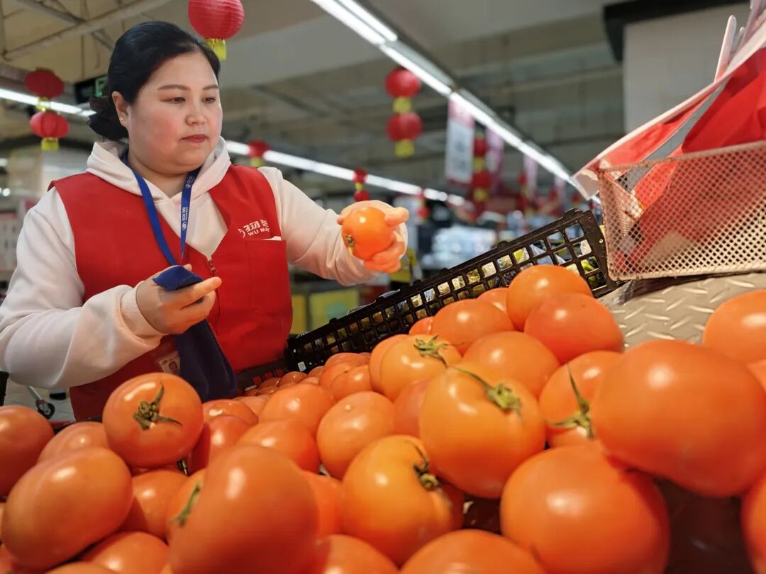 菜市场二层,300平方米的蔬果区井然有序,300余种果蔬新鲜饱满、色泽鲜亮,错落陈列在货架上,全方位满足着百姓春节餐桌的多样需求与美好期盼。蔬果经理王洪艳正忙碌着将西红柿整齐码放到货架上。“您瞧这西红柿,都是沙瓤的,软硬正合适,要是怕酸,回家放两天再吃,口感更绵密。”恰逢一位老街坊驻足选购,王洪艳热情地招呼道,语气里满是邻里间的熟稔与热忱。
