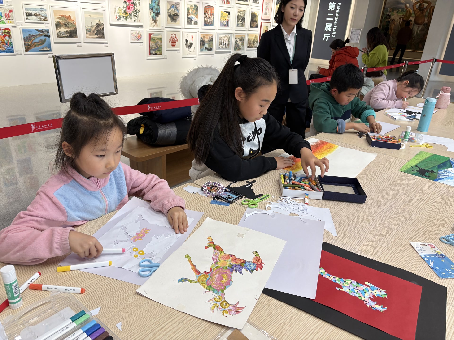 “是风骨,是精神。”社教老师解答,徐悲鸿通过长期观察马匹动态,积累了上千幅速写作品,创作出了《奔马》等一批经典作品,既保留了中国水墨的写意气韵,还融入了西画的解剖和透视学,“参观过展览,相信大家心中已经印下各种马的形象,我们也来尝试画一匹骏马。”