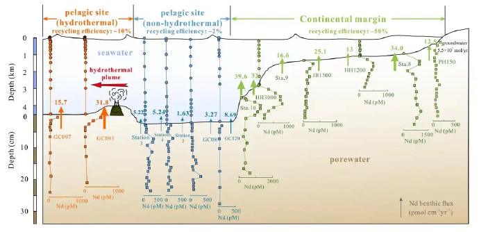 以往,学界对深海稀土的循环模式研究主要集中在“自上而下”阶段,也即铁锰氧化物在沉降过程中能清除水中的稀土,让稀土从表层海水循环沉积到底层海水及沉积物中。邓义楠团队对来自东南太平洋、受热液活动显著影响的深海盆地的海水、孔隙水及生物磷灰石进行系统的地球化学分析后发现,深海稀土元素还存在“自下而上”的循环模式,也即铁锰氧化物在海水-沉积物界面的早期成岩过程中会释放稀土,并向上扩散进入海水中。