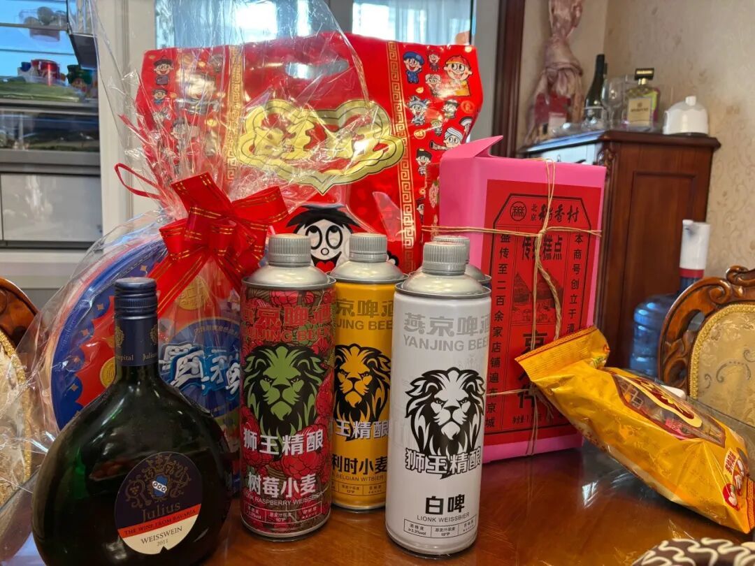 采访中,张鼎然和珍妮你一言我一语,满是欢喜:“我们准备了燕京啤酒、牛栏山二锅头,还有鹏程肉制品。”张鼎然说。珍妮接过话茬,说道:“对,肉好吃,酒好喝,在顺义过年,非常开心。”