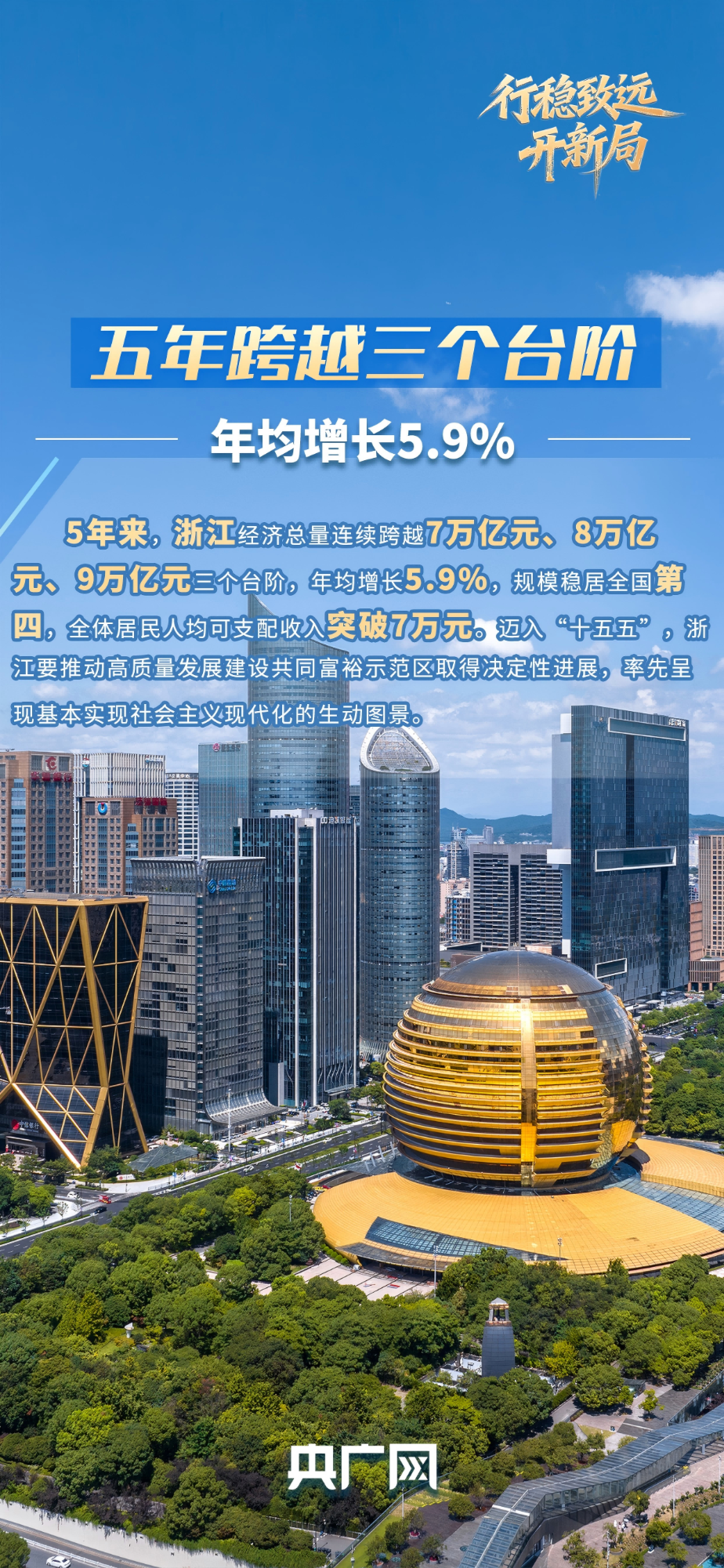 从东海之滨的数字浪潮到山区海岛的共富实践,从绿水青山间的生态画卷到科创大走廊的创新脉动,5年来,浙江的经济总量连续跨越7万亿元、8万亿元、9万亿元3个大台阶,年均增长5.9%,规模稳居全国第4位。浙江以仅占全国1%的土地,贡献了近7%的经济总量,展现了一幅高质量发展的恢弘画卷。