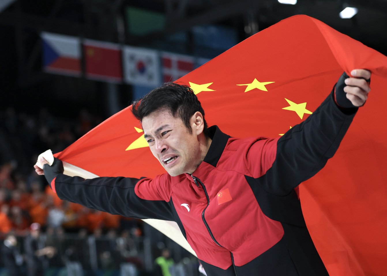 夺冠后,宁忠岩举着国旗绕场庆祝,泪如雨下