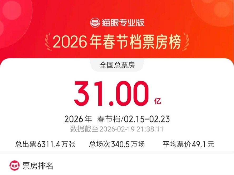 据猫眼专业版数据,2026年春节档档期总票房(含预售)破31亿,《飞驰人生3》《惊蛰无声》《熊出没·年年有熊》分列前三位。详情>>