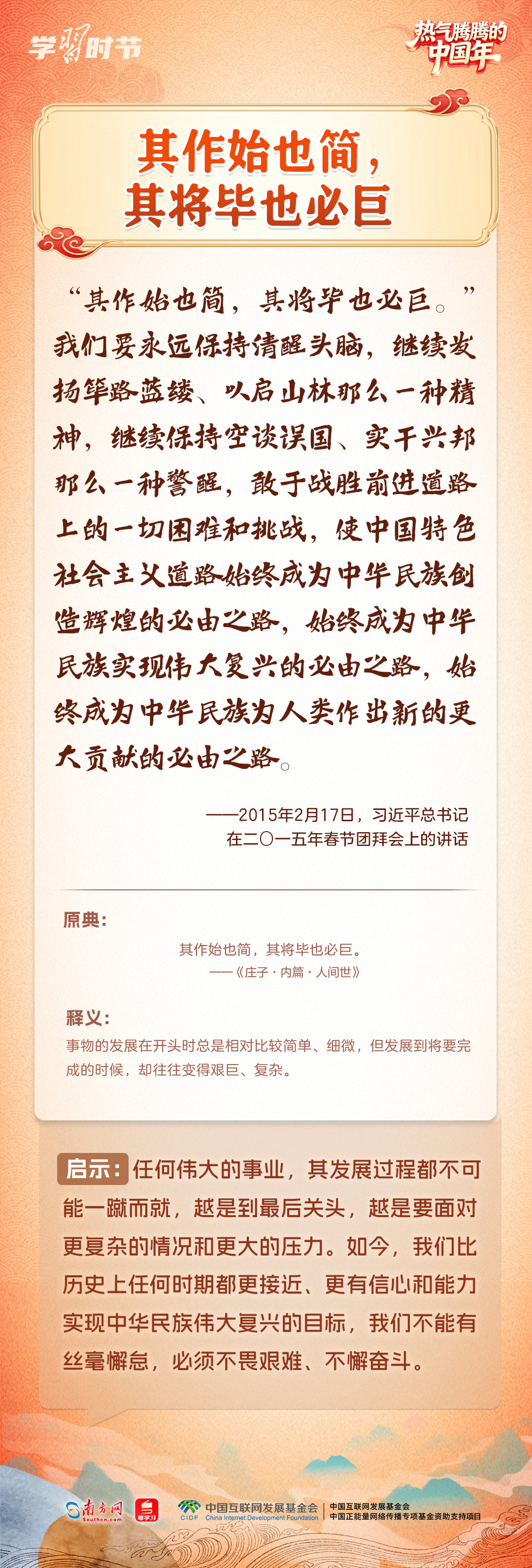 “在中国式现代化新征程上策马扬鞭、勇往直前,共同开创更加美好的未来。”2月14日,在二〇二六年春节团拜会上,习近平总书记的重要讲话振奋人心。党的十八大以来,习近平总书记多次在春节团拜会上发表重要讲话,回望旧岁、展望新年,向大家致以美好的新春祝福。在讲话中,习近平总书记常常巧妙引用古典名句砥砺人心,指引我们脚踏实地、锐意前行,提醒我们珍视亲情、涵养孝道。一起来学习感悟。