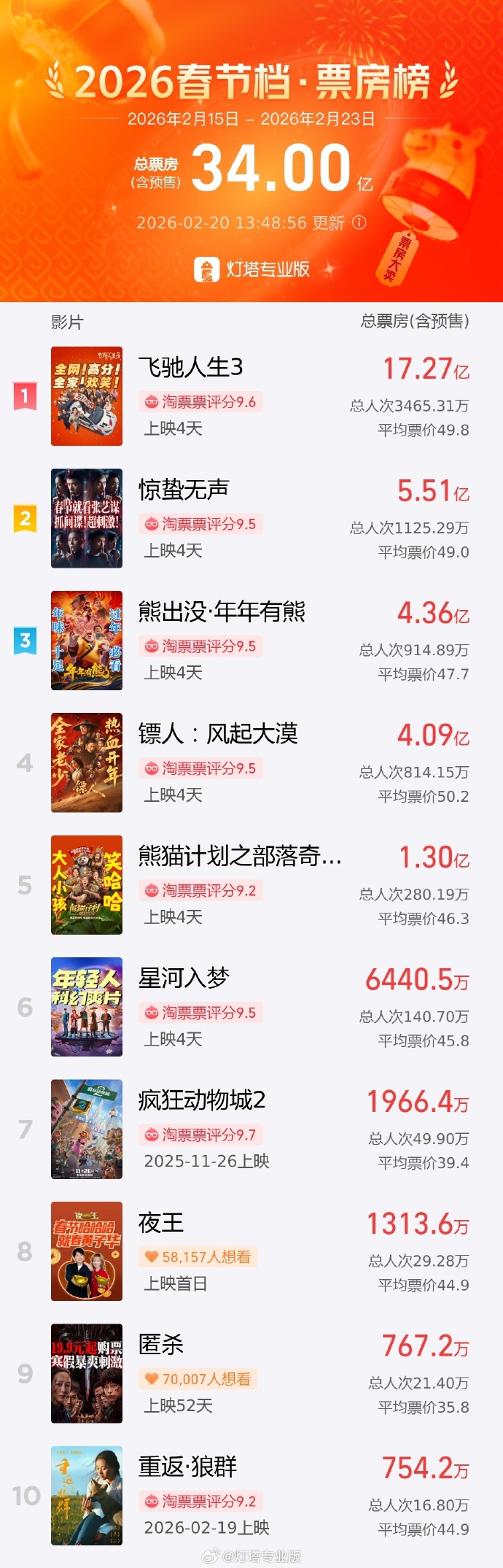 据灯塔专业版,截至2月20日13时48分,2026春节档(2月15日-2月23日)档期总票房(含预售)突破34亿。