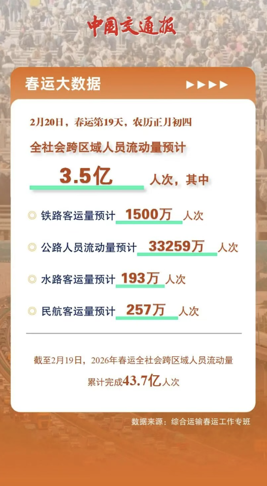 来自综合运输春运工作专班数据显示,2月20日(春运第19天,农历正月初四),全社会跨区域人员流动量预计达35209万人次,其中