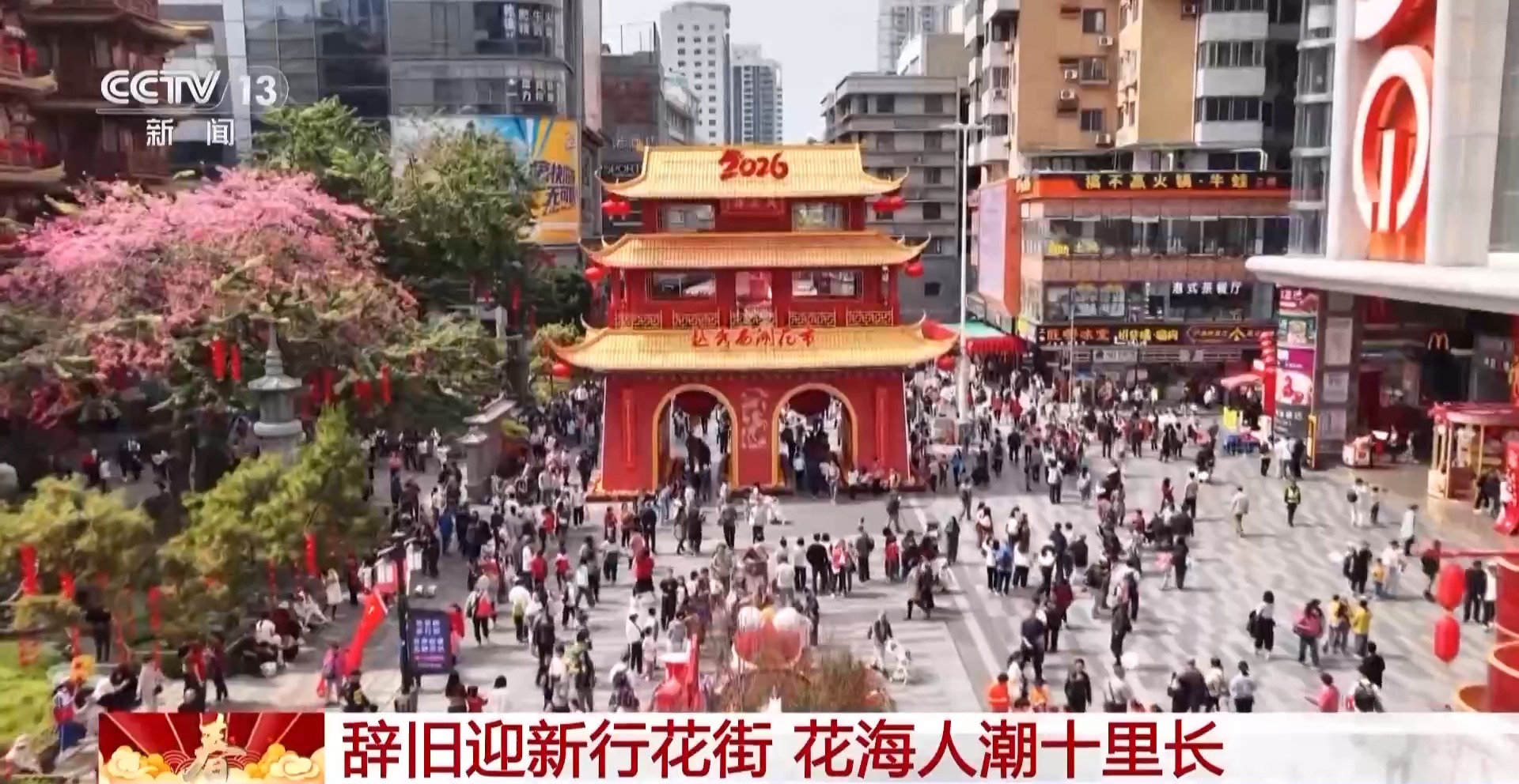 总台央视记者 邵舒宽:我现在所在的位置就是广州最具代表性的迎春花市——越秀西湖花市的主牌楼外。牌楼是岭南迎春花市重要的一个组成部分。岭南花市萌芽于唐宋时期,而今年这里的主牌楼正是以宋代广州共乐楼作为原型设计的。以前竖起高高的牌楼,人们就知道这里聚集了迎春的花市,而如今,凝聚着古韵新风和地方特色的牌楼不仅是花市的入口,更是一座座时空之门,以花为引,带领游人穿梭其中,感受中华优秀传统文化在新时代绽放的璀璨光彩。