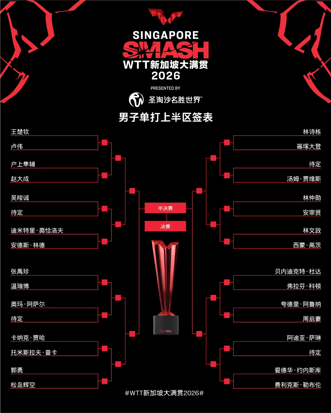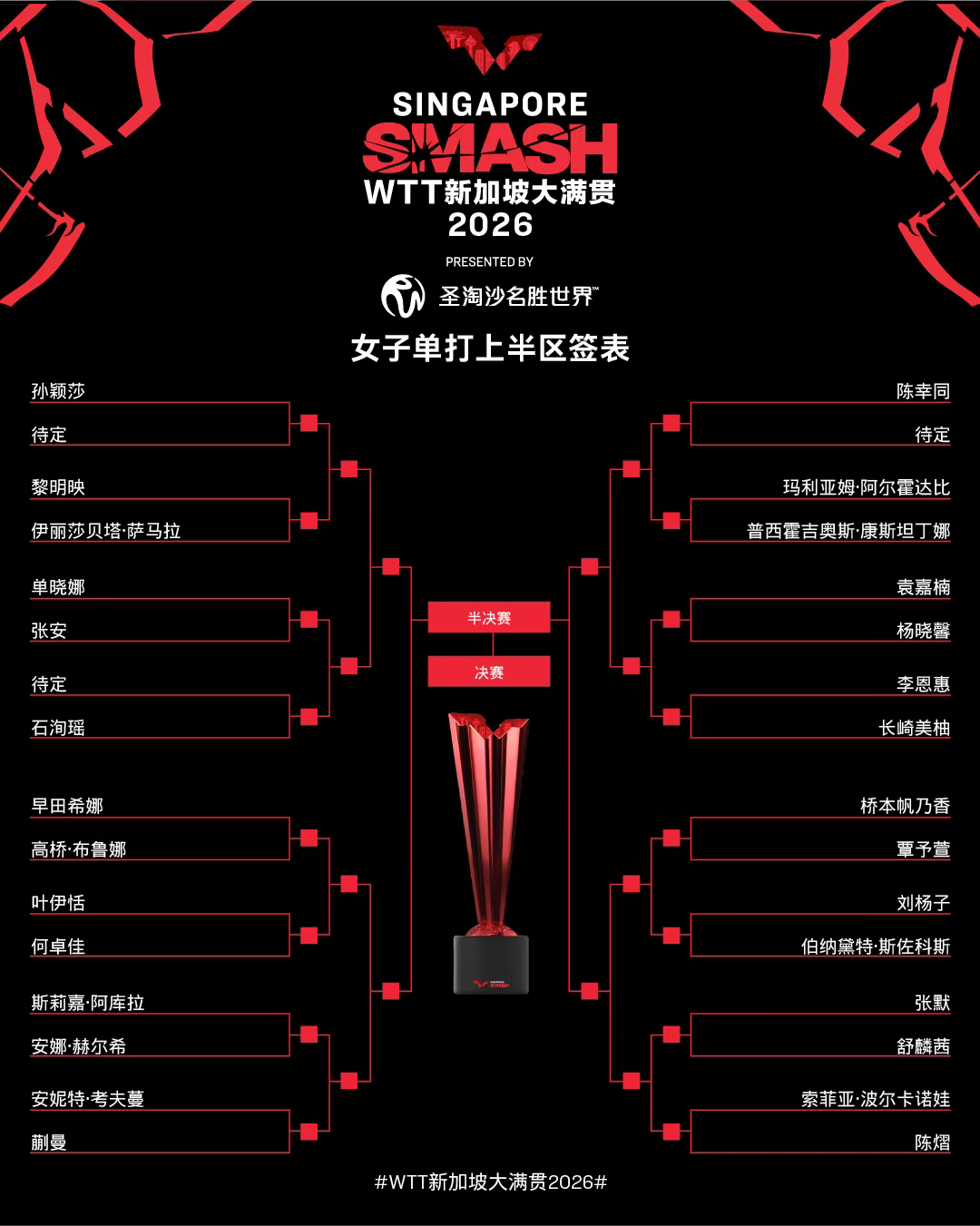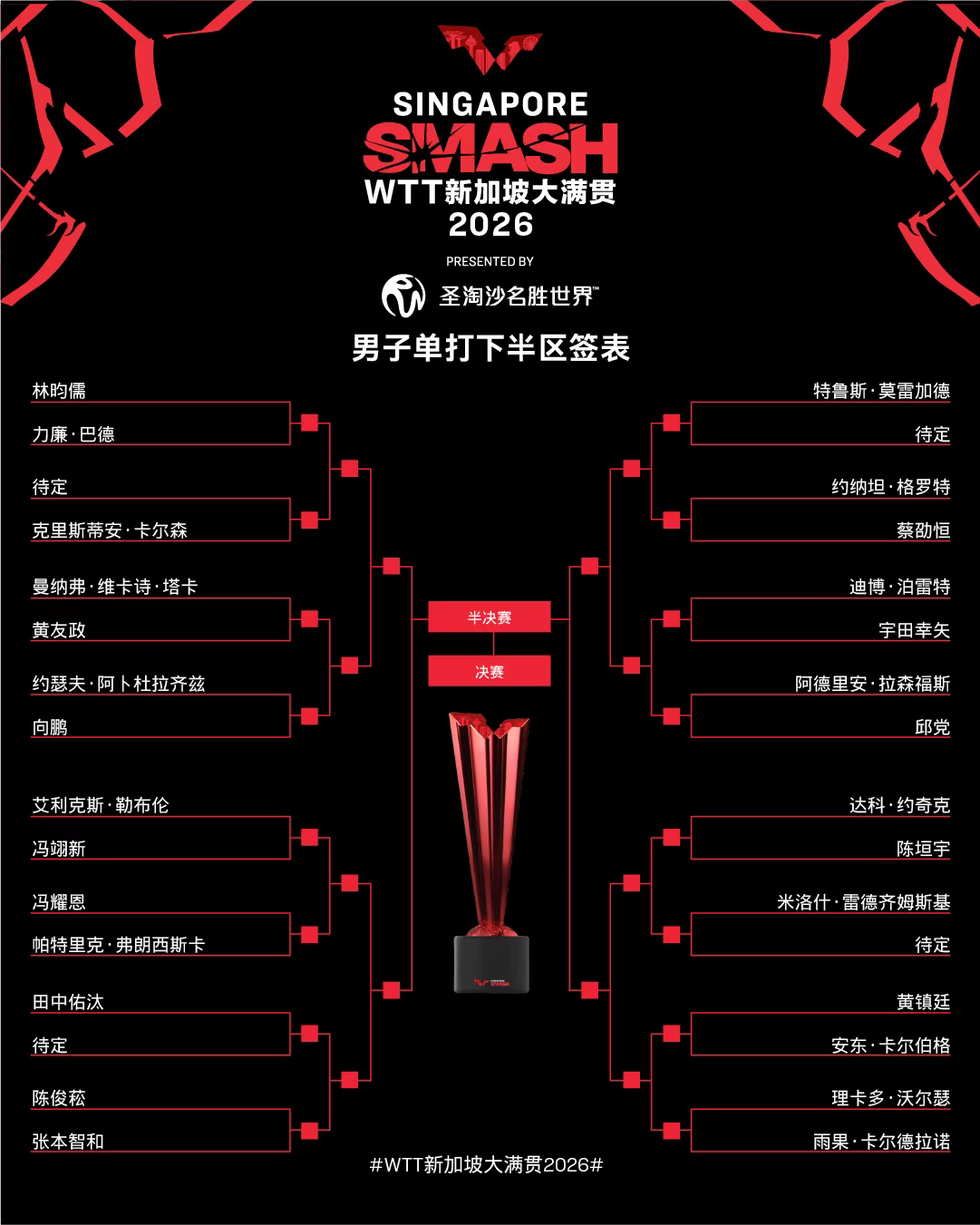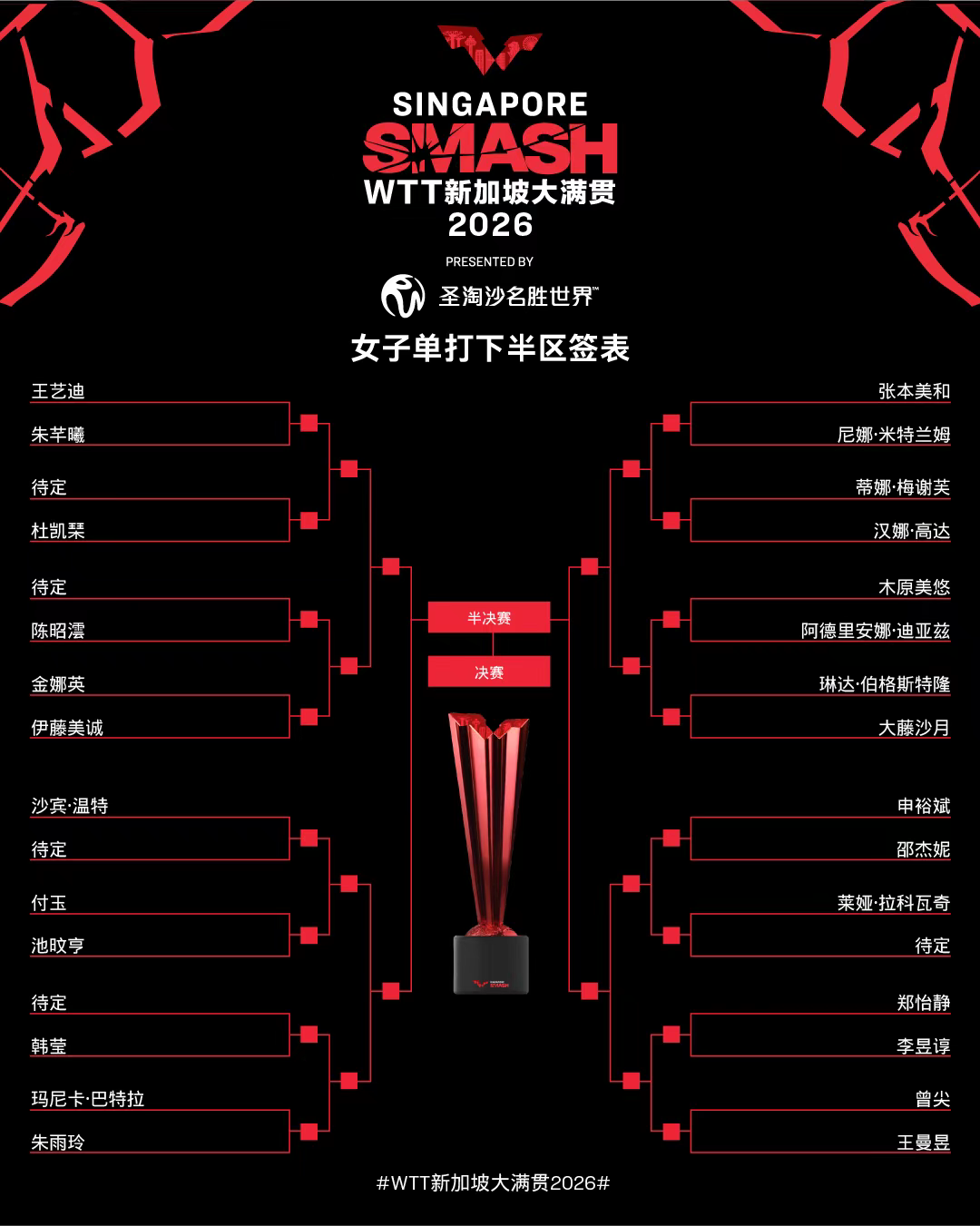 2月20日,2026年WTT新加坡大满贯赛女单、男单签表均出炉。两天后,WTT新加坡大满贯赛正赛就将打响。