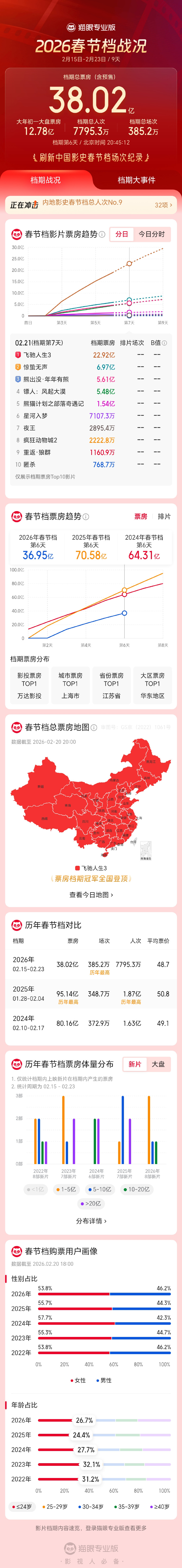 据猫眼专业版数据,2026年春节档档期总票房(含预售)破38亿,《飞驰人生3》《惊蛰无声》《熊出没·年年有熊》分列前三位。