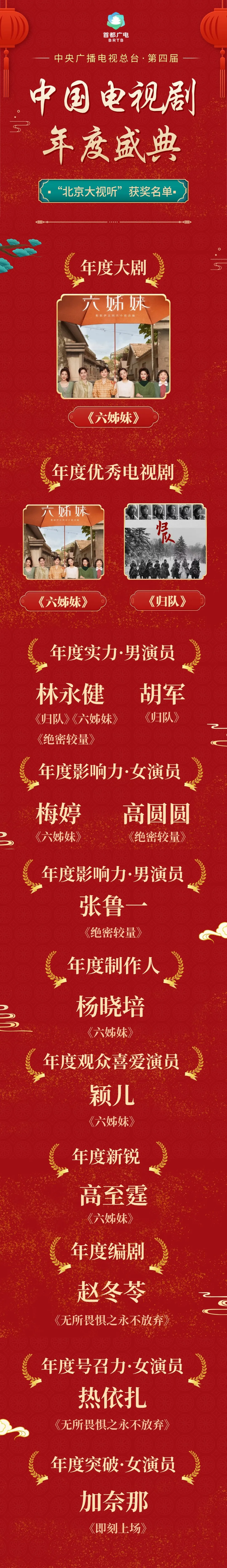 林永健凭借“北京大视听”重点文艺项目《归队》《六姊妹》《绝密较量》、胡军凭借“北京大视听”重点文艺项目《归队》双双获得年度实力男演员;