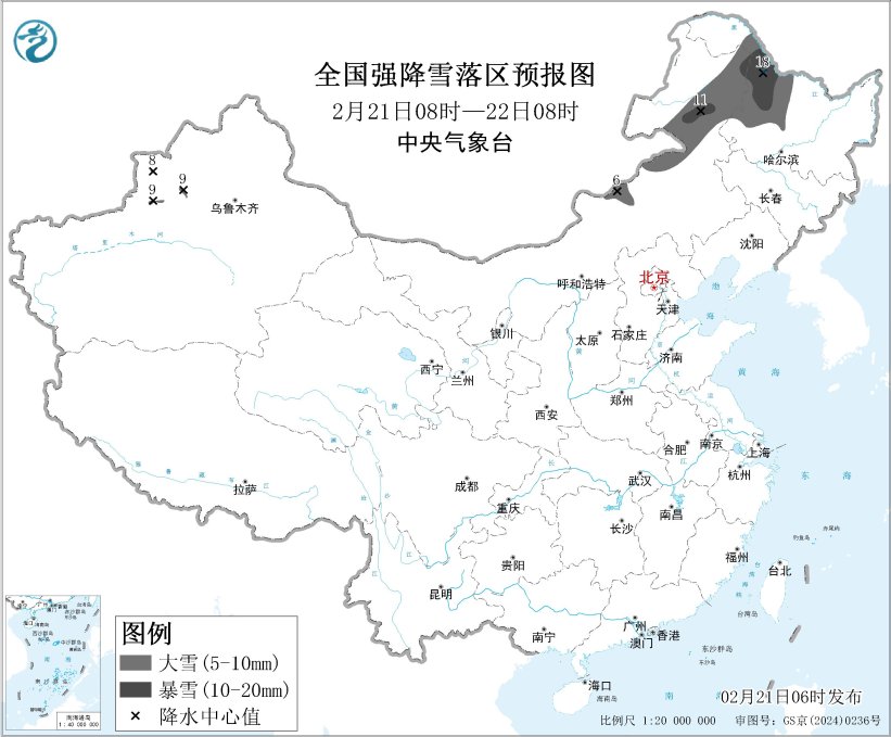 中央气象台2月21日06时发布暴雪蓝色预警: