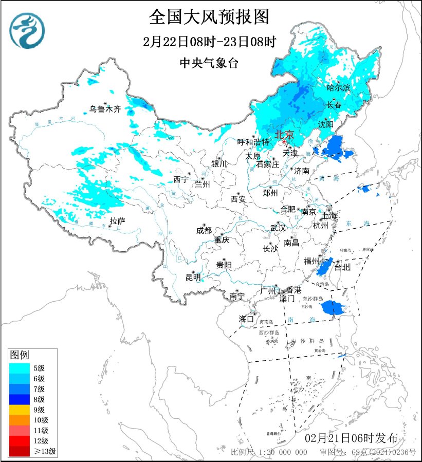2月22日08时至23日08时,新疆北疆东部、内蒙古中东部、青海北部、西藏北部、甘肃河西、华北北部、东北地区大部、辽东半岛、山东半岛等地的部分地区有5~7级风,阵风8~10级。渤海海峡、黄海北部海域、台湾海峡、巴士海峡西部海域、南海东北部部分海域将有7~8级、阵风9级的大风。