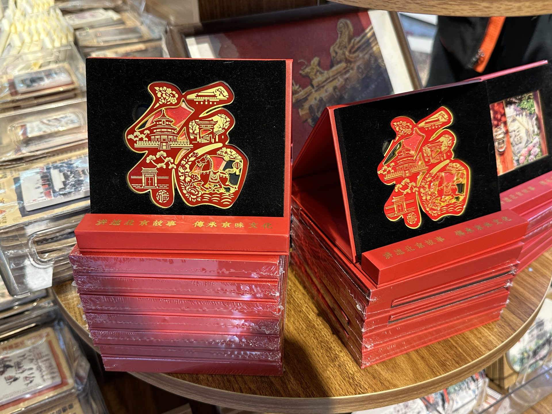 春节期间,融入马年元素的新品成了最抢手的“香饽饽”。“京韵纳福”金属冰箱贴以非遗剪纸为基底,将四合院、牌楼、天坛等老北京标志性景致融入“福”字的一笔一画中,一匹骏马在中央奔腾;“京福雅韵”冰箱贴上,复刻了朱漆门上的狮首门环,轻轻翻开,一副对联跃然眼前,仿佛亲手推开了一扇老北京胡同的院门。来自东北的唐先生一口气买下两款:“做工精致,很喜庆,还有浓浓的北京特色,买回去当礼品送人,特别合适。”