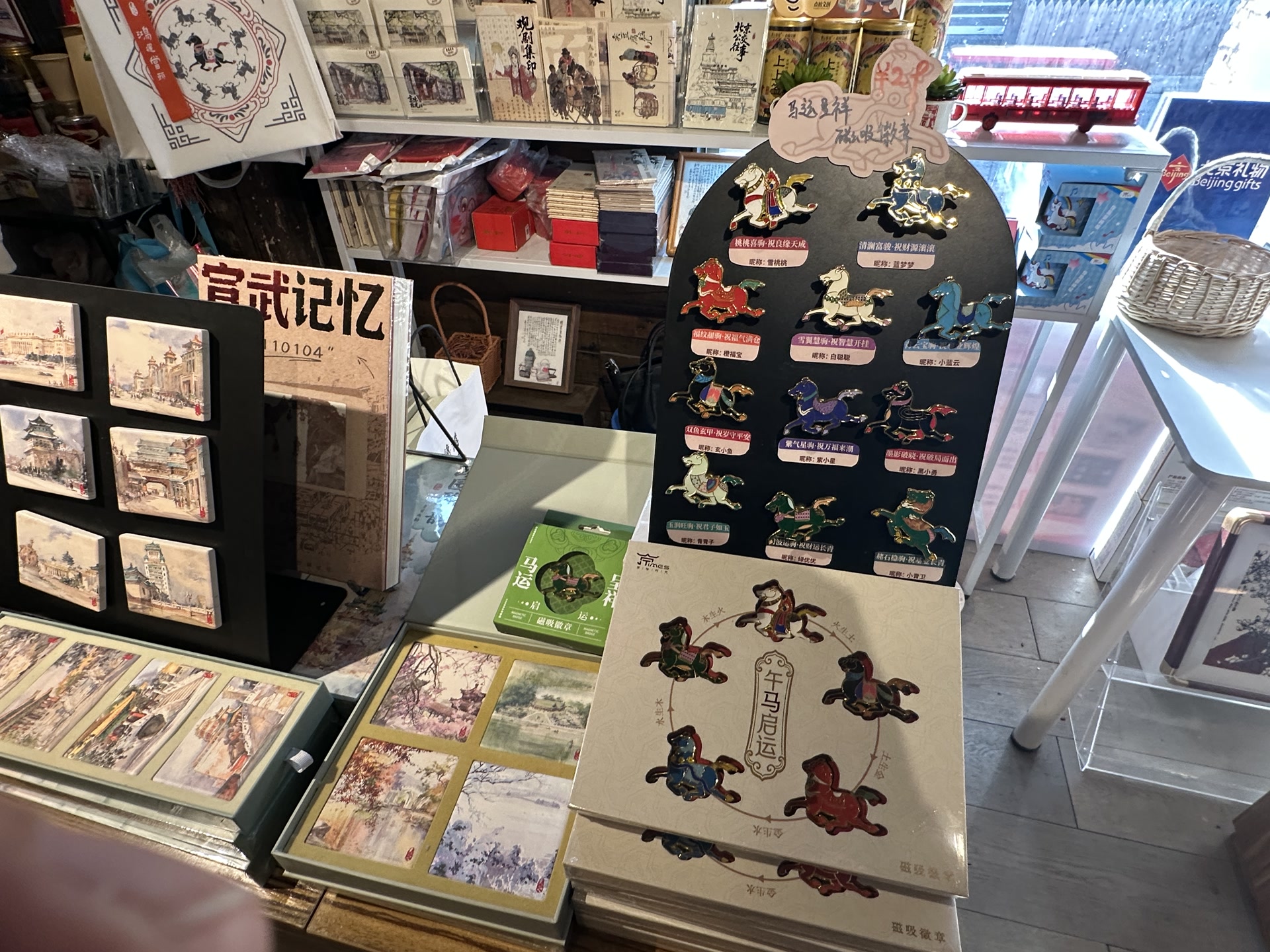 除了马年元素的文创,店内满墙的老北京元素搪瓷缸、“北京风情”陶瓷冰箱贴、“北京经典公交线路站牌”冰箱贴等京味文创,也同样吸引游客驻足挑选。这几日,店长罗皓每天都守在店里,一整天都在不停地接待顾客,向大家介绍、讲解,声音虽略带沙哑,脸上却始终挂着笑意,“通过交流,游客不仅能买到喜欢的文创,也能有机会了解这些文创背后的北京故事和文化,我觉得这样的忙碌很有意义。”罗皓说。