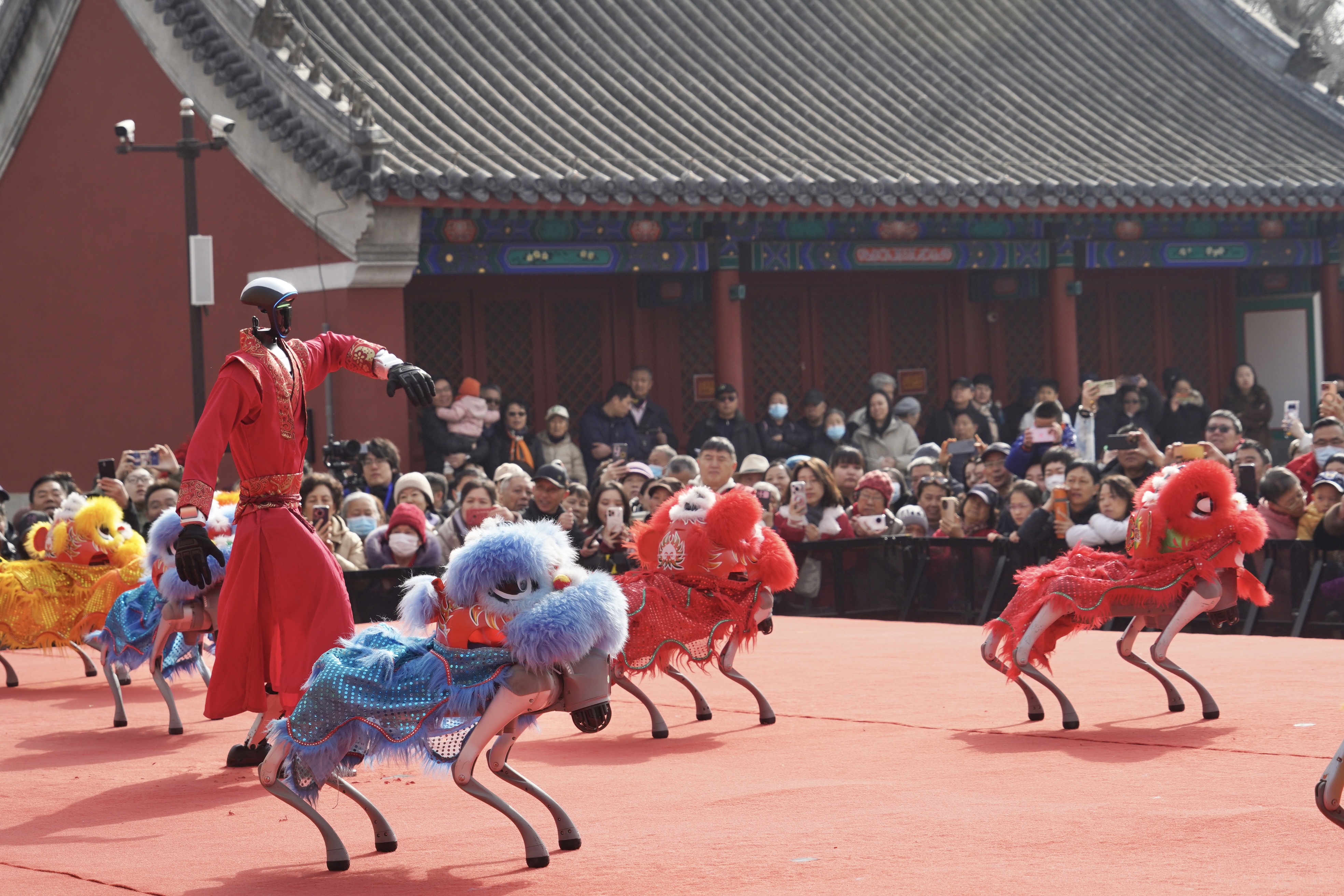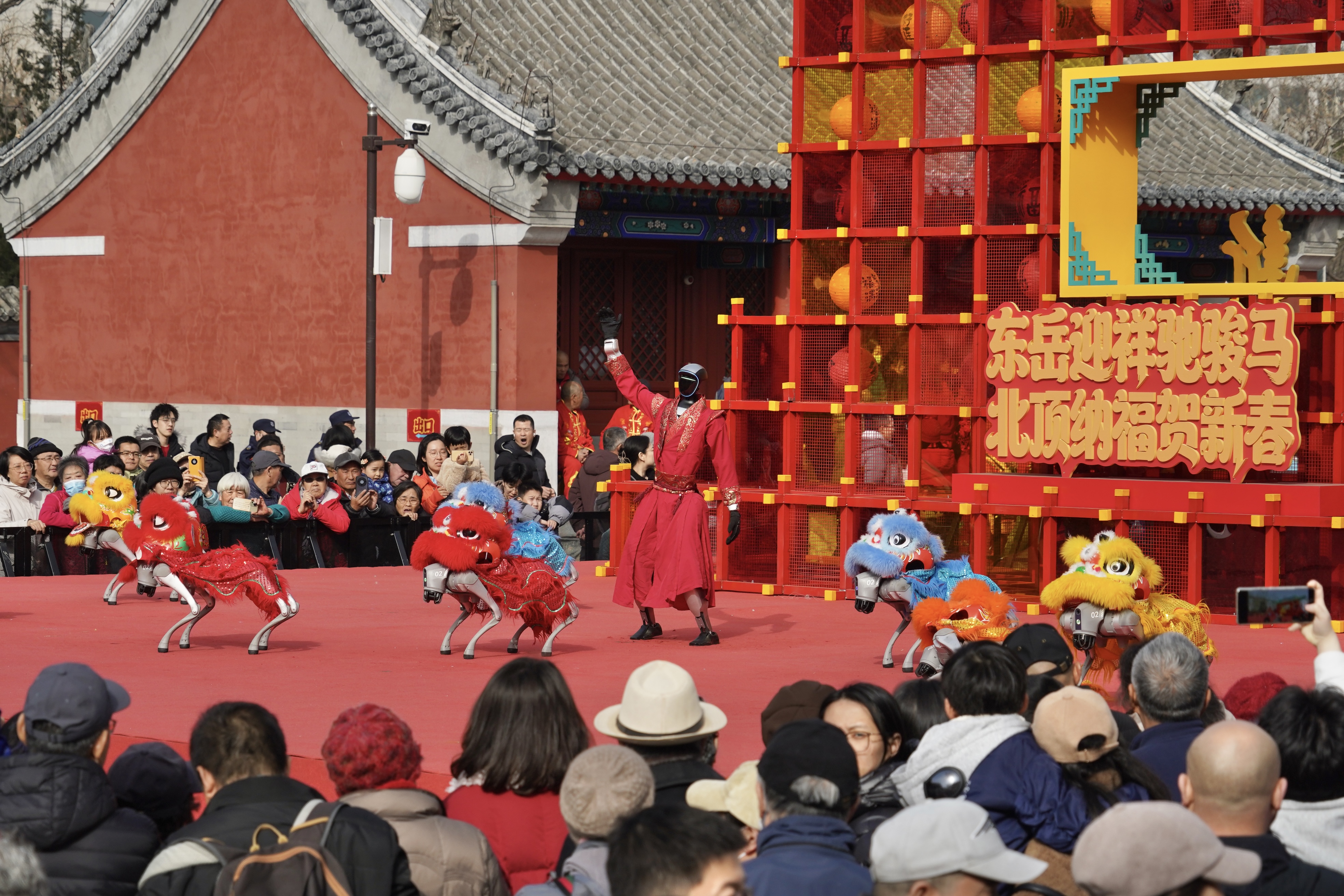 国家级非遗广东潮響鼓社潮汕英歌舞队员身着主题服饰精彩亮相,幡鼓齐动十三档、朝阳区东坝乡非遗金玲祖师及徐水舞狮等北方经典花会表演在双庙间同步展演。北顶娘娘庙更是聚焦“非遗体验+沉浸互动”,孝文化主题展与NPC巡游为游客带来沉浸式文化体验。机器人与仿生机器狗组成的祥狮战队献上“科技炫舞秀”,将人工智能与传统民俗深度融合,为古建庙宇注入新潮活力。