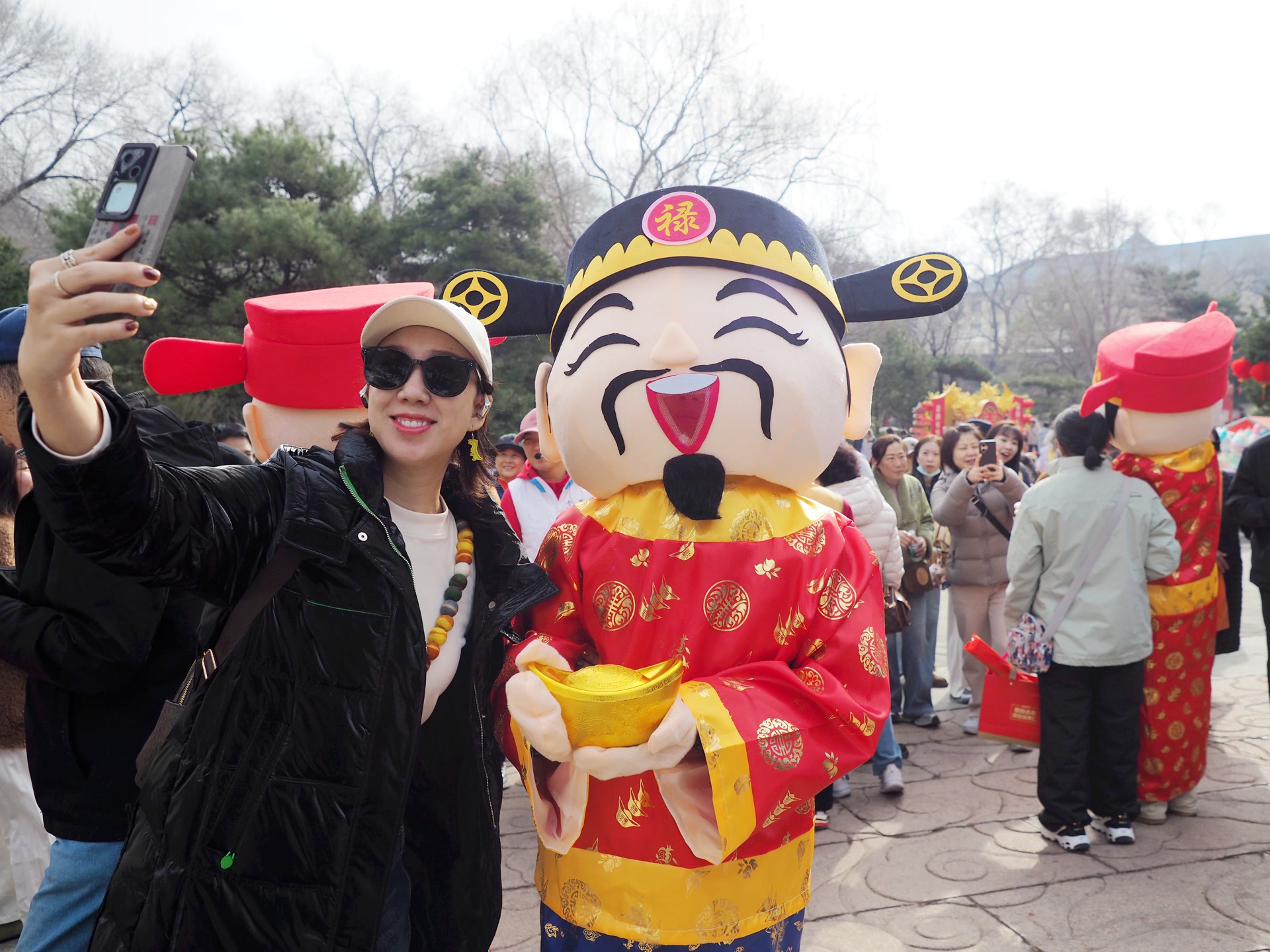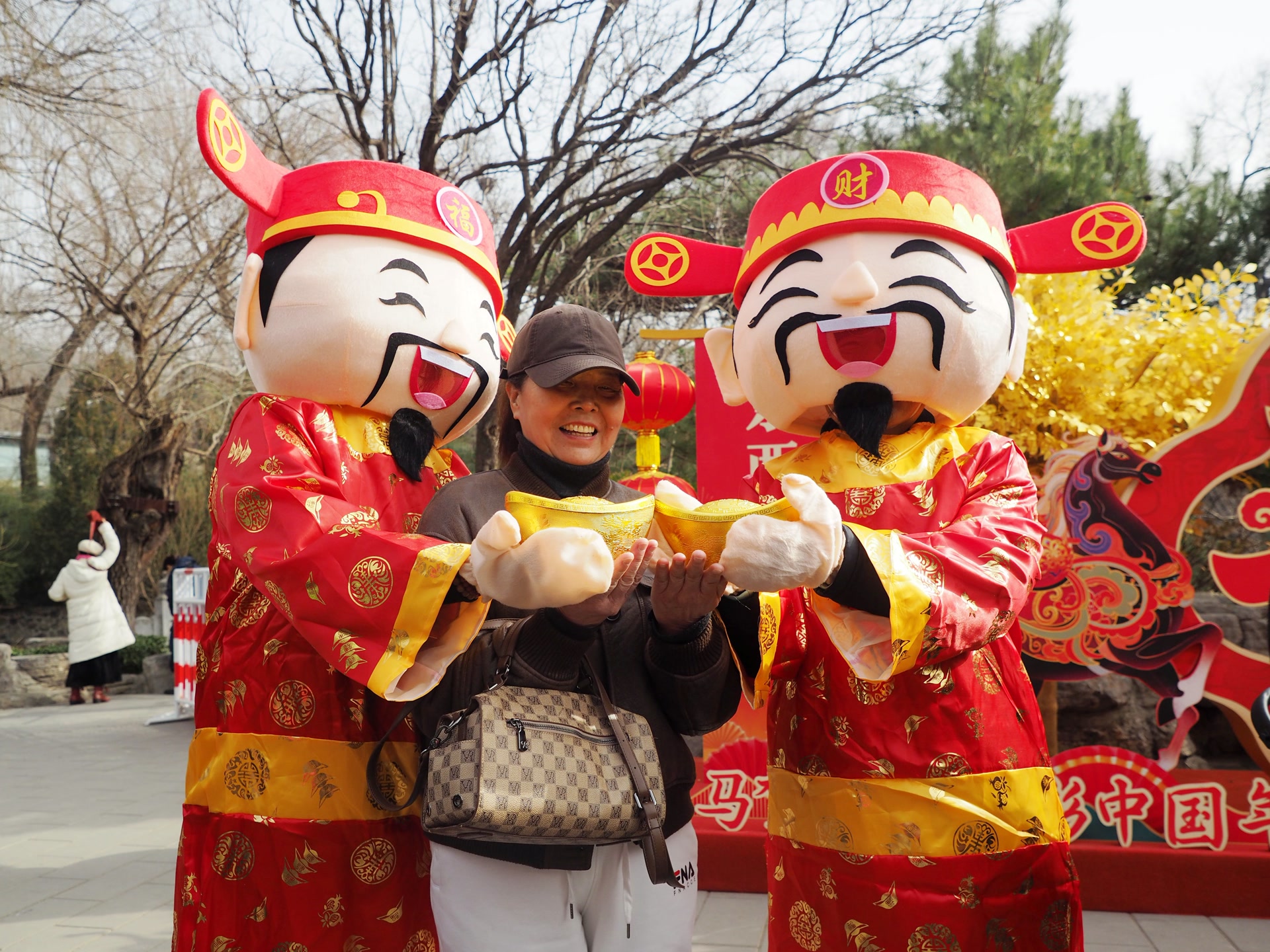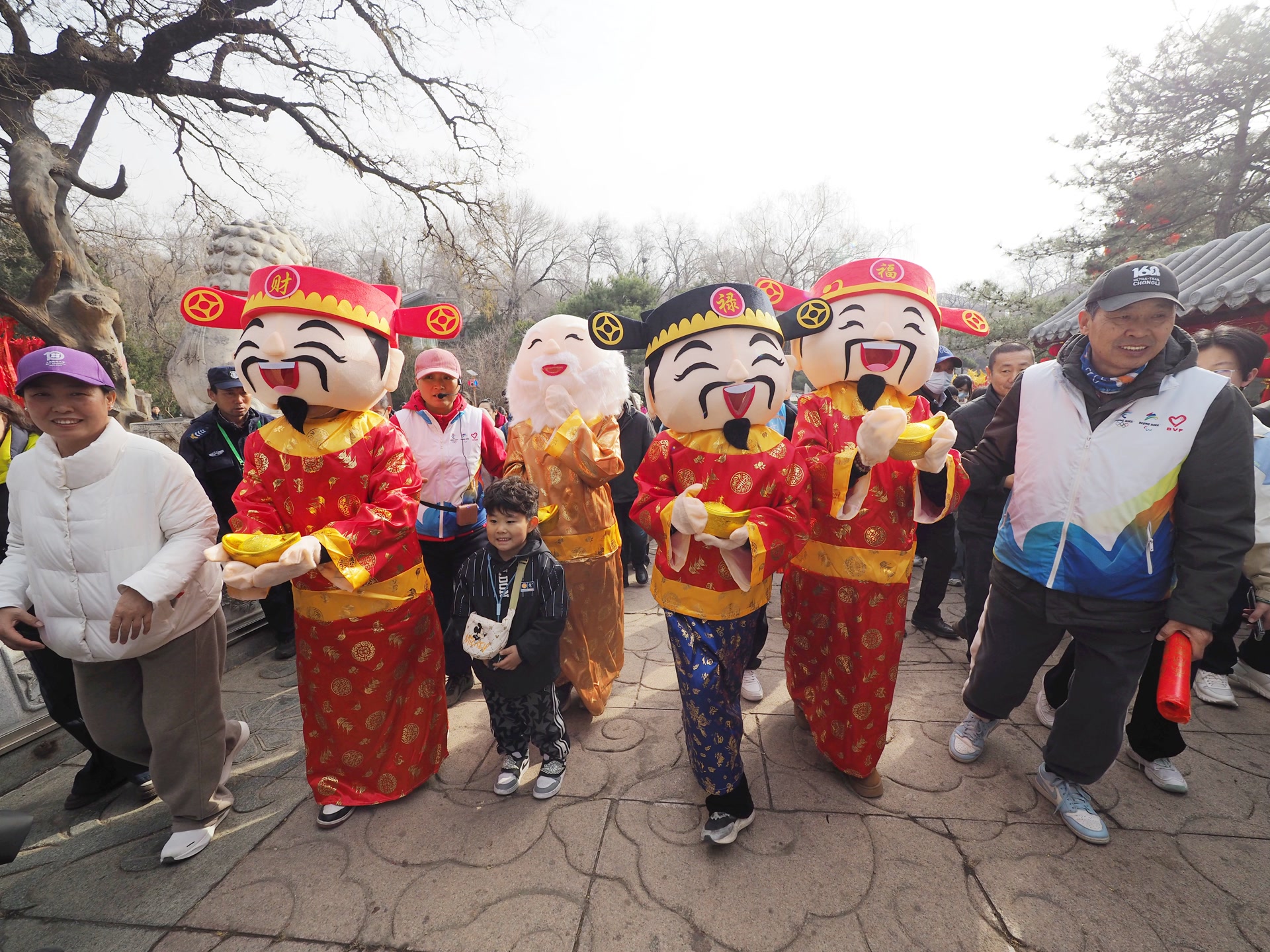 2月21日,正月初五,八大处新春文化庙会举办“迎财神”活动,游客争相与“财神”合影留念,迎财纳福闹新春。