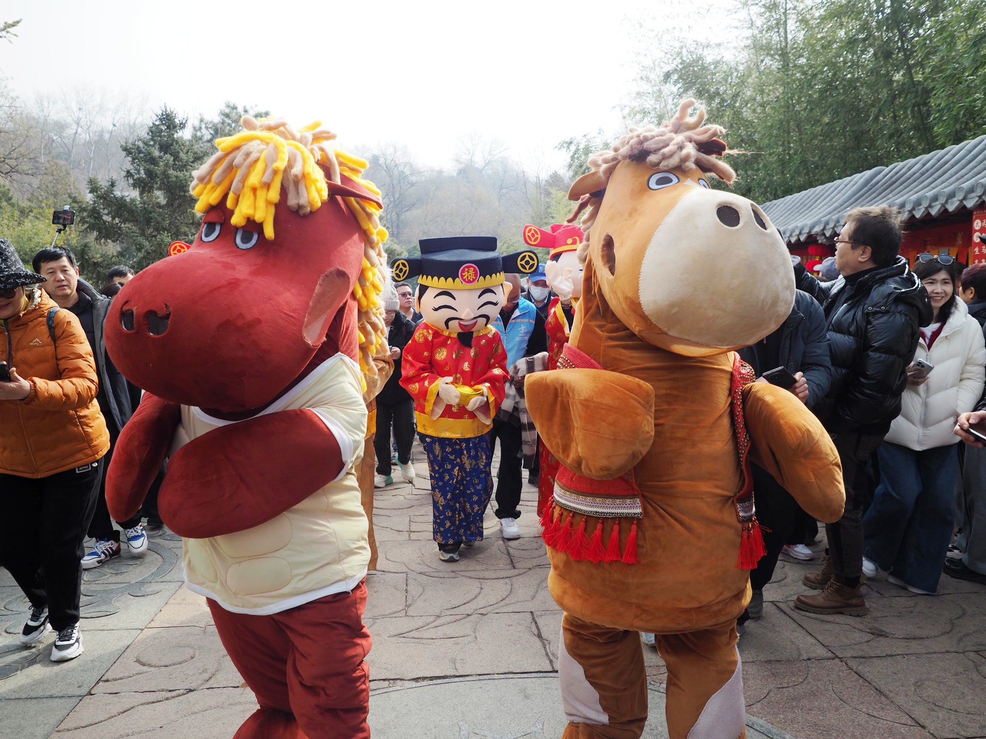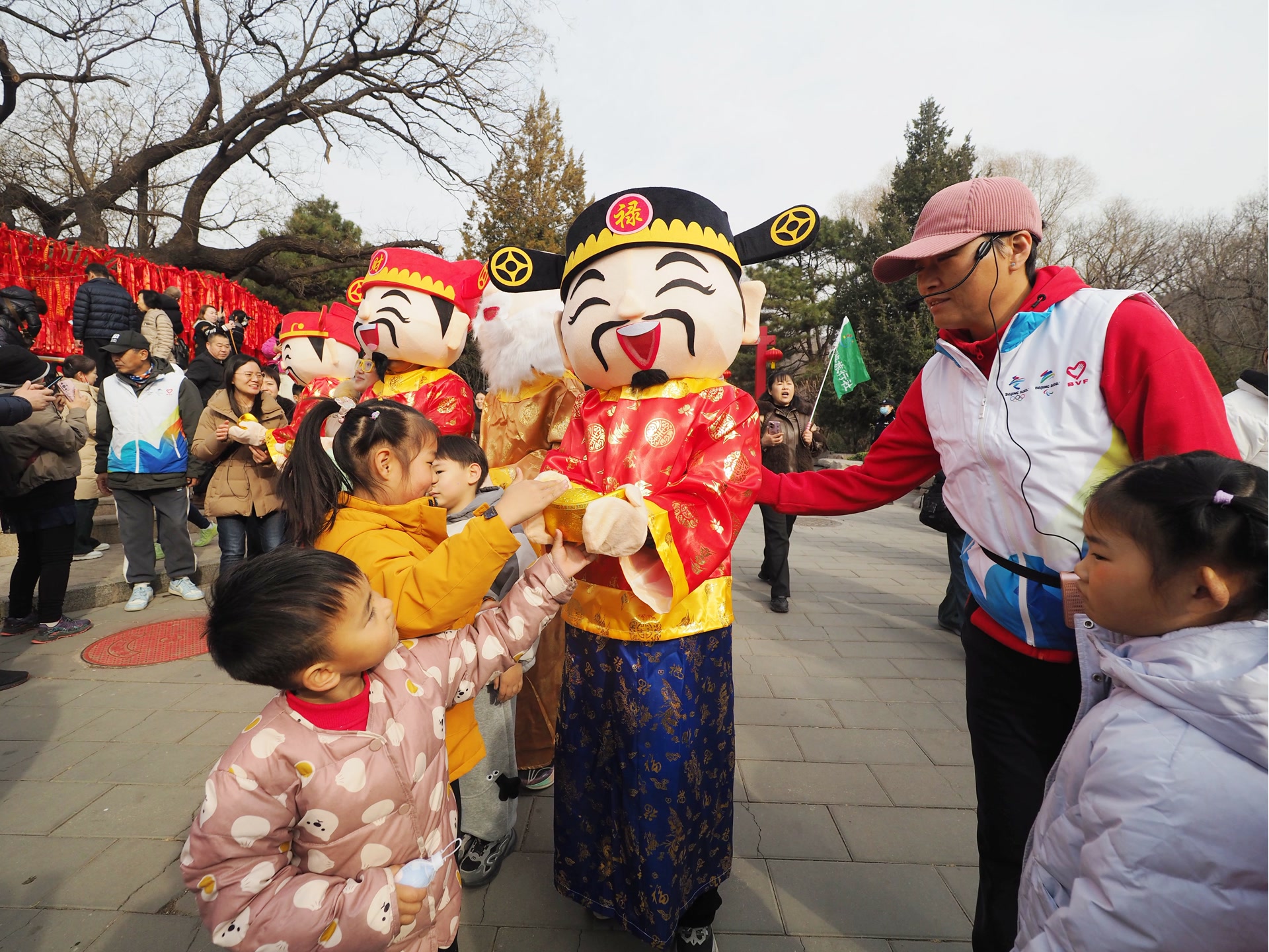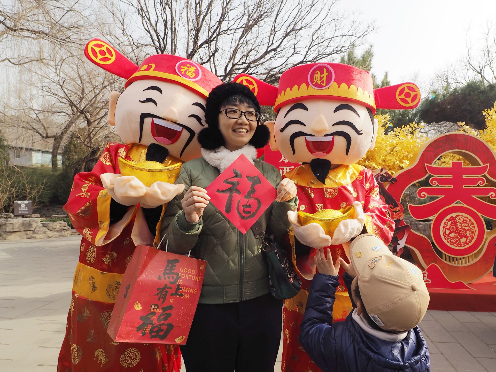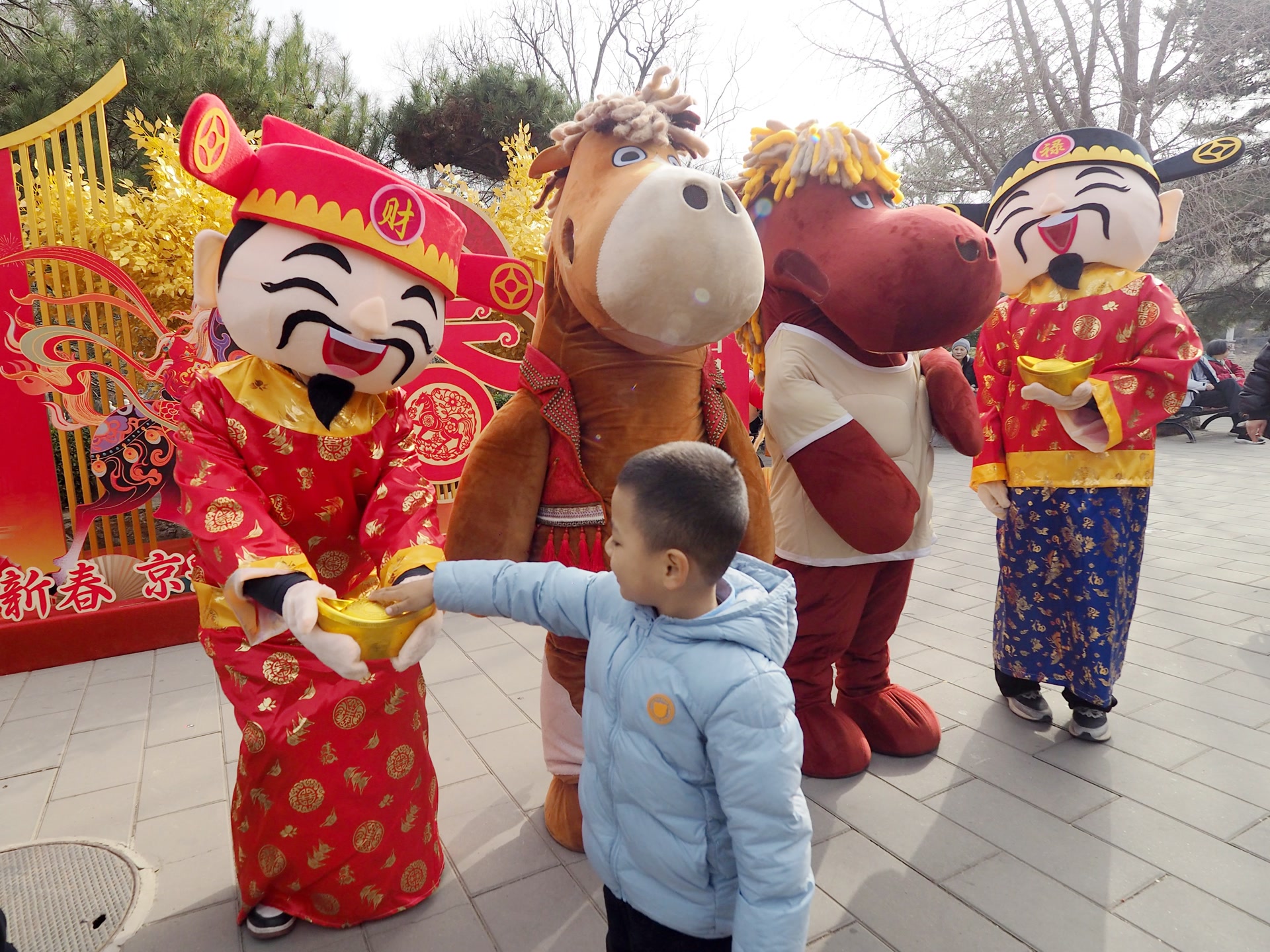 2月21日,正月初五,八大处新春文化庙会举办“迎财神”活动,游客争相与“财神”合影留念,迎财纳福闹新春。