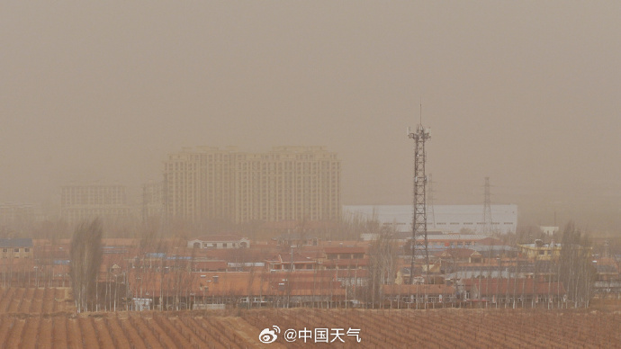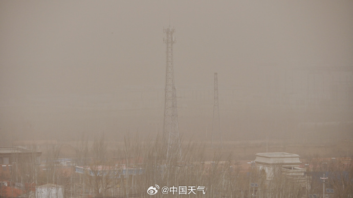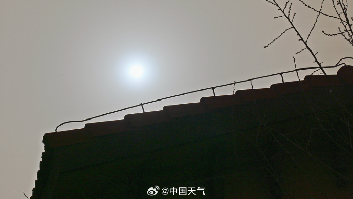 今天午后,北京西部出现沙尘天气,天空昏黄,能见度降低,太阳散发出微微蓝色光芒。