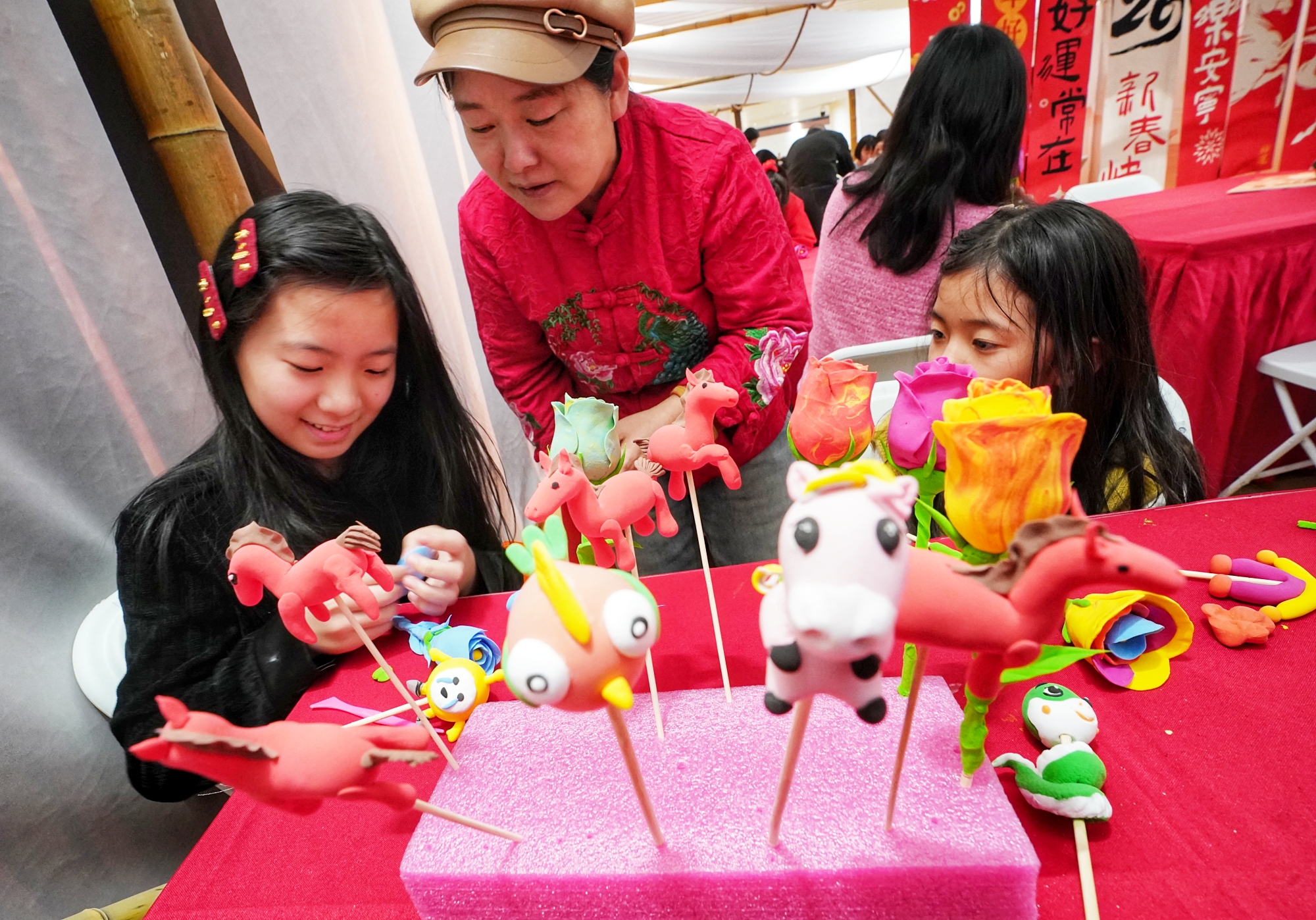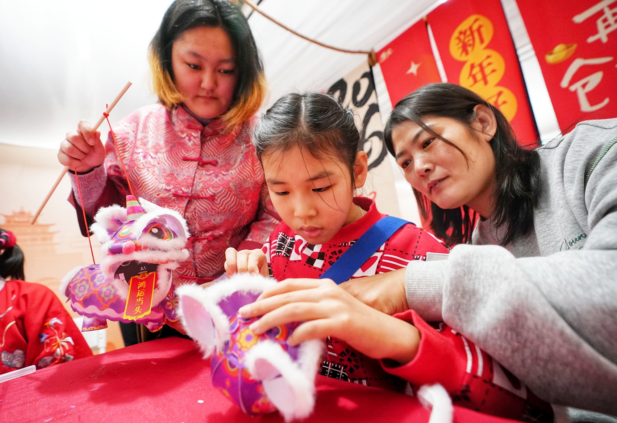 正月初一至初五,“春风马蹄·集”春节非遗市集热闹非凡。除了大运河沿线特色文创,兔爷制作、剪纸、捏面人等传统民俗体验区前人头攒动。8岁的乐乐初次体验“捏面人”的快乐,揉、搓、捏、压,一双小手忙个不停,尝试做出一朵玫瑰花。乐乐爸则激活儿时记忆,边制作边指导。“现在电子产品太多了,我想让儿子离开屏幕,多动手做点东西。”另一张桌子旁,六年级学生张艺馨也在老师指导下,手工完成了醒狮制作,“我想让我妈发朋友圈,让更多人都来参与!”她举着成品,眼睛亮闪闪。