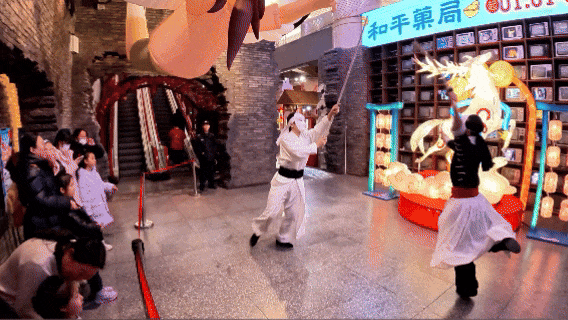 锣鼓声声,京剧演员配合着鼓点,用一段行云流水的花枪为和平菓局第四届冬日胡同文化节开场,近距离沉浸式的体验感,让游客一进门就体验到了地道京味年。