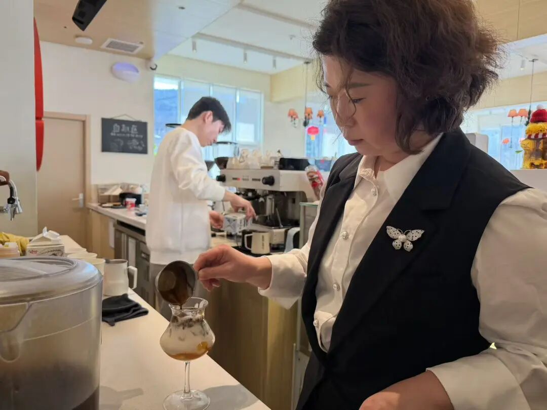 “这是今天的第13杯‘柿柿如意’了。”葛晓丽熟练地将咖啡液倒进装着牛奶和柿子酱的杯子里,“从八点营业到现在,我们已经出了67单。很多客人一大早就来了,还好我们的咖啡机保持24小时待机状态,预热时间都省去了,客人不用等待就能喝上热咖啡。”