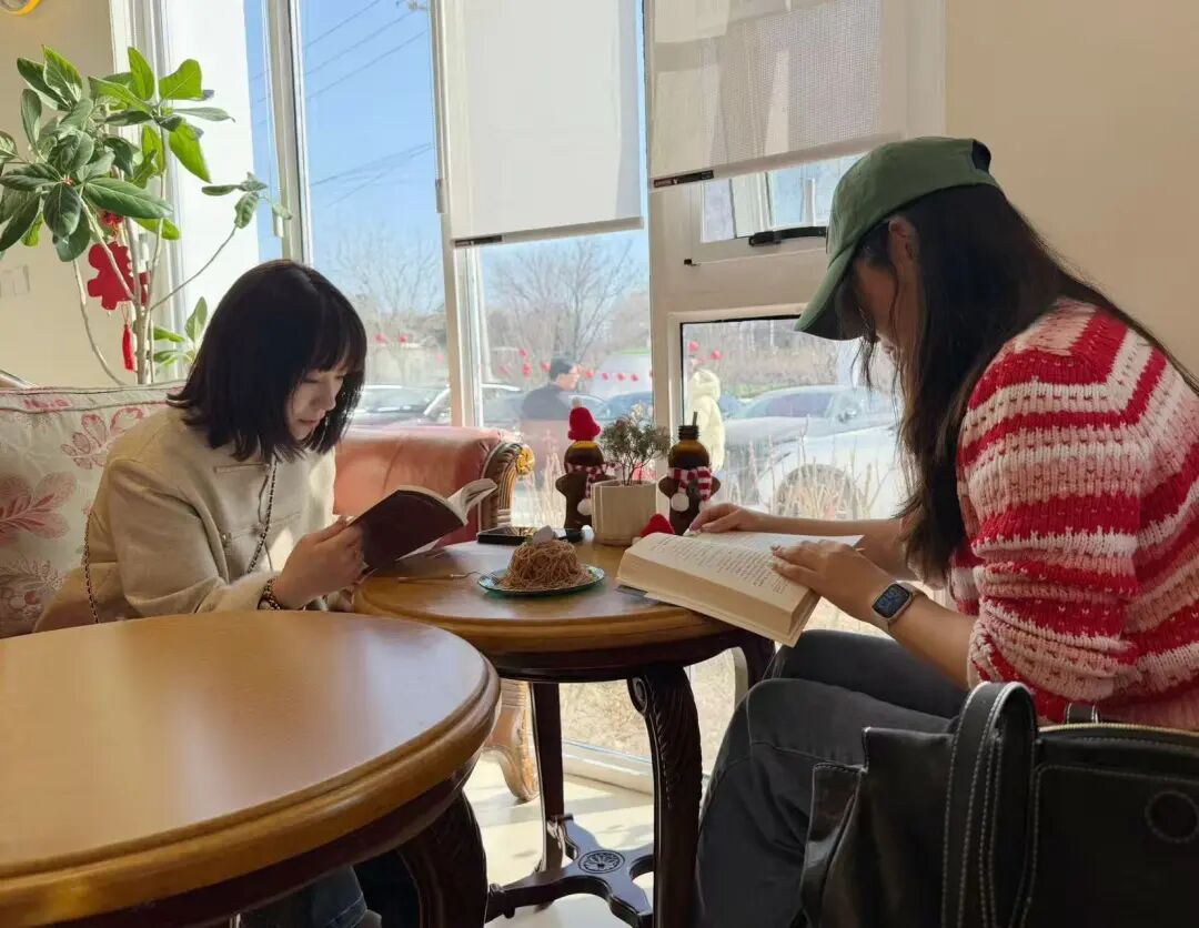 靠窗的位置上,从朝阳区专程赶来的赵女士正和朋友享受着难得的闲暇时光。她刚饶有兴致地欣赏完一旁的红色雕塑树,“这里很有艺术氛围,还有板栗味的小甜点,晒太阳也特别舒服。”赵女士轻声说道。随后,她和朋友各自从书架上挑了一本书,打算就着午后的暖阳翻上几页。“以前过年要么走亲戚串门,要么去商场凑热闹,今年想换种方式。”她笑着说,“在这里,我能彻底放下焦虑,找回了很久没有体会过的平静。”