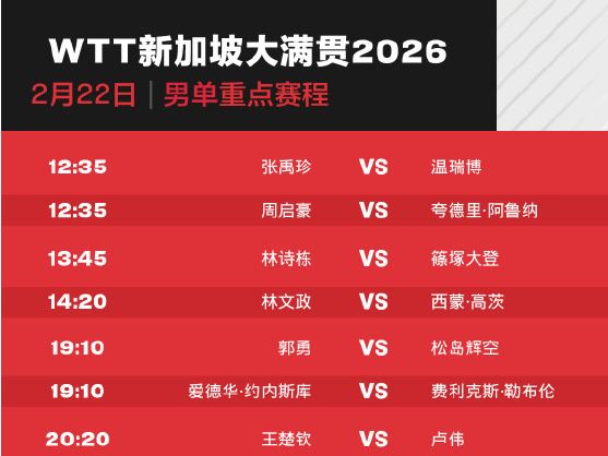 今天,2026年WTT新加坡大满贯正赛打响,首日国乒8人出战。详情>>