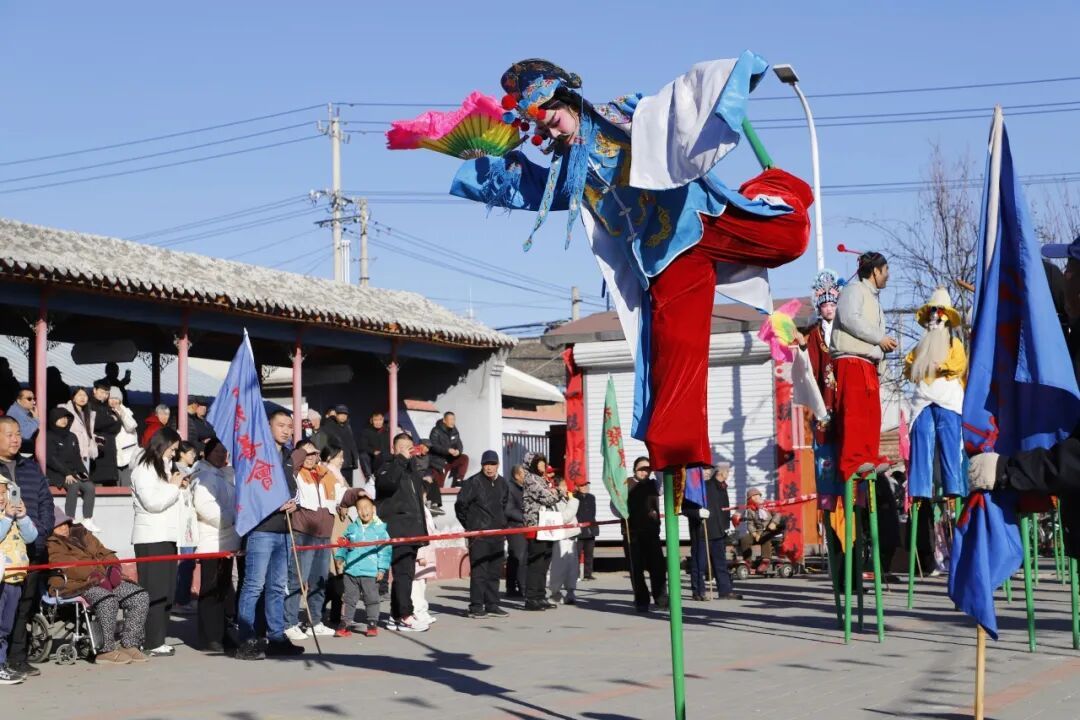 9时,北小营镇大胡营村广场上热闹非凡。一场精彩绝伦的大胡营高跷秧歌演出在这里上演,村民们齐聚一堂,共同沉浸在欢腾热闹的年味儿之中。