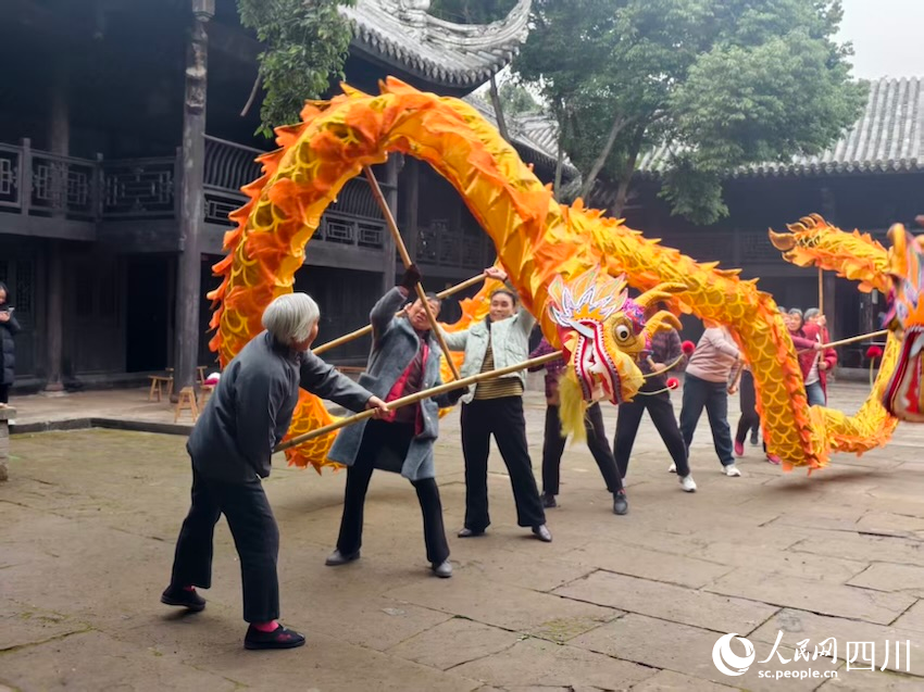 69岁的兰婆婆每周坐两小时大巴从县城赶到镇上练习舞龙,于她而言,龙杆一握、龙身一舞,一路的舟车劳顿便化作满身舒畅;65岁的邓婆婆退休后靠搓麻将打发时间,加入龙灯队后牌桌上再也不见她的身影,“舞龙以后,我的腰不酸了,腿不疼了,就连困扰多年的小肚子也消下去了。”