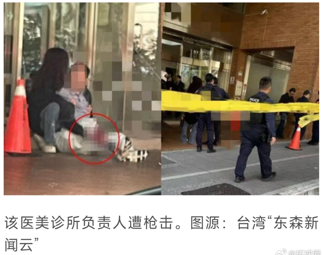 报道称,该医美诊所位于大楼8层,负责人萧某21日中午率员工在大楼1层举行开工团拜时,突然蹿出一名戴着棒球帽、口罩的男子,朝萧某腿部连开4枪,导致萧某右小腿中弹后倒地,2名员工被波及、小腿擦伤。警方在现场采证,共找到3枚弹壳及1枚弹头。