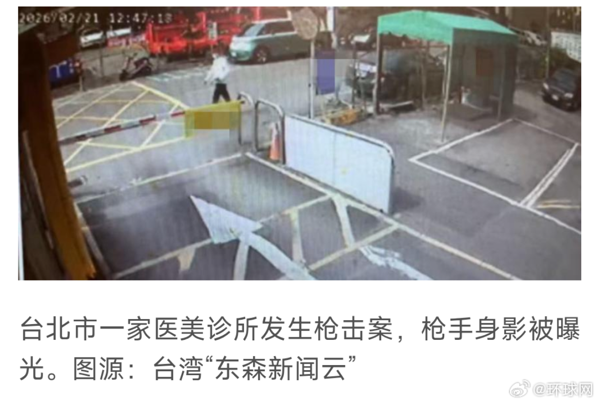 环球网综合中时新闻网、“东森新闻云”等台媒报道:台北市一家医美诊所21日发生枪击案,诊所65岁萧姓负责人率员工正在进行新春开工团拜时,遭不明人士连开4枪,造成萧某腿部中弹、2名员工被波及。据报道,萧某经送医治疗,无生命危险,警方正循线追缉枪手,通过调阅监控画面,枪手身影22日被曝光。