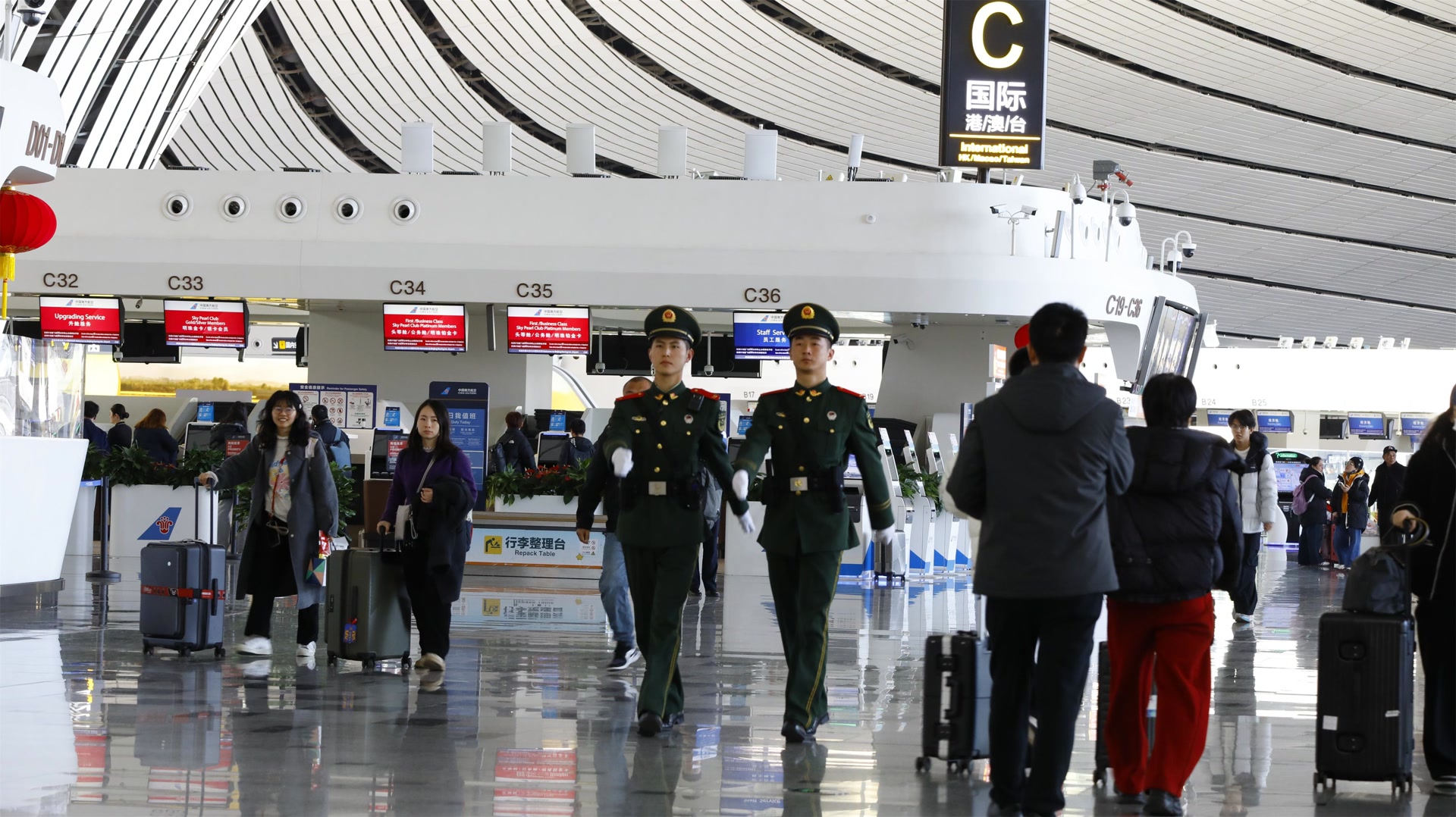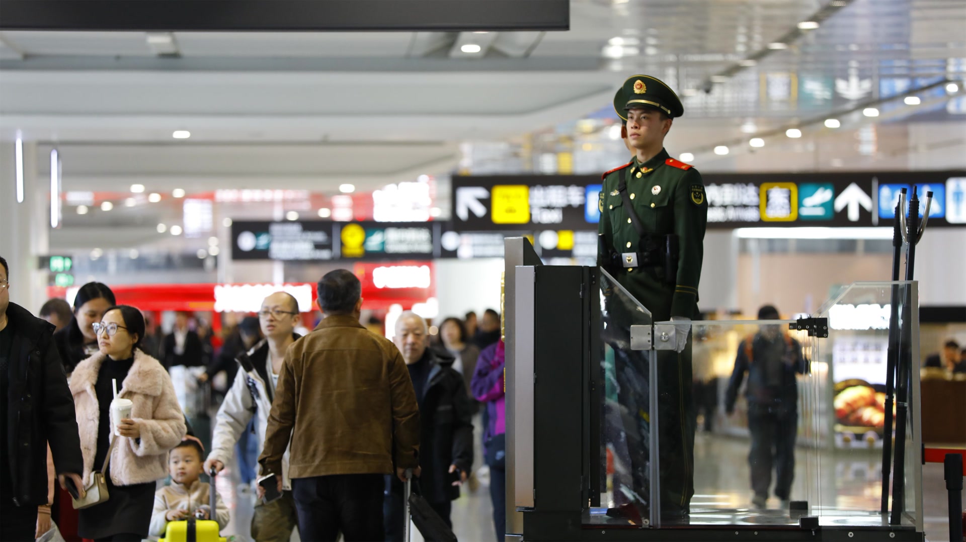 2026年春运返程客流持续高位运行。在北京大兴国际机场,白天时段的客流尤为集中,大批旅客通过地铁大兴机场线和19号线进出机场。担负执勤任务的武警北京总队执勤第十五支队官兵,在航站楼与地铁换乘区域加强值守,全力守护旅客“最后一公里”的安全与温暖。