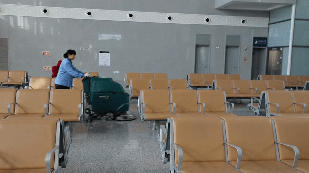 保洁员清扫地面。
