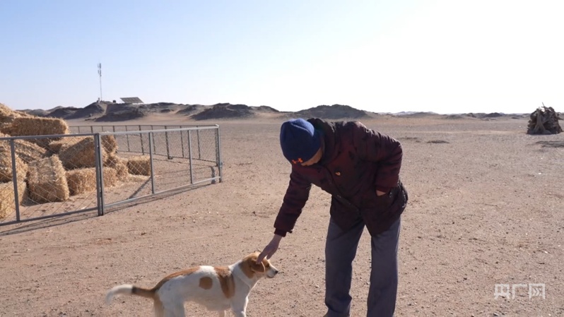戈壁旷野上,尼玛老人俯身轻抚爱犬(央广网发 常涛 摄)