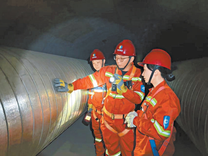 周桐和郭旭东首先来到井下的检查室,举起手电照向管道上一段带有刻度的金属构件。“这是补偿器,裸露在外的金属部位要定期除锈,还要刷上防腐漆,防止锈蚀。”在排气扇的轰鸣声中,周桐大声向记者讲解。