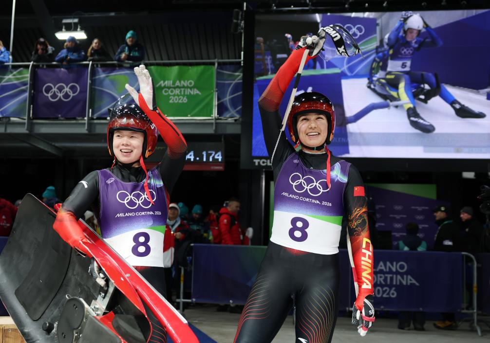 古丽洁乃提·阿迪克尤木(右)/赵佳颖在雪橇女子双人赛第二轮比赛后。新华社记者 丁旭 摄