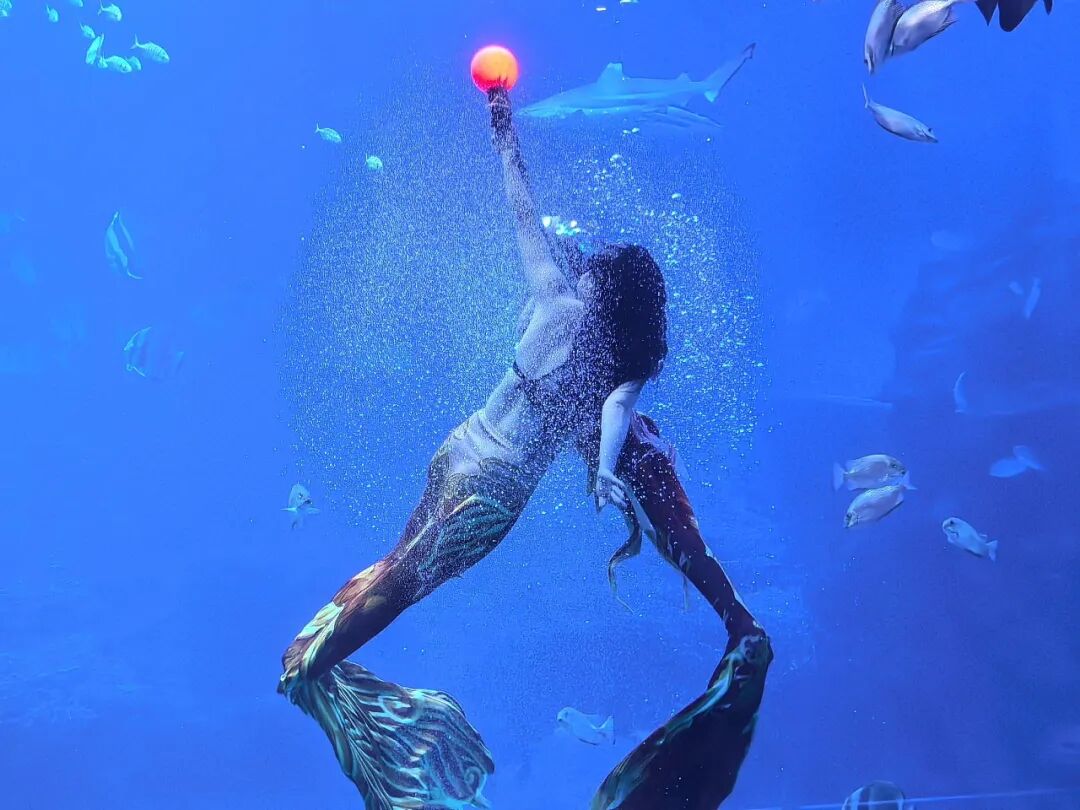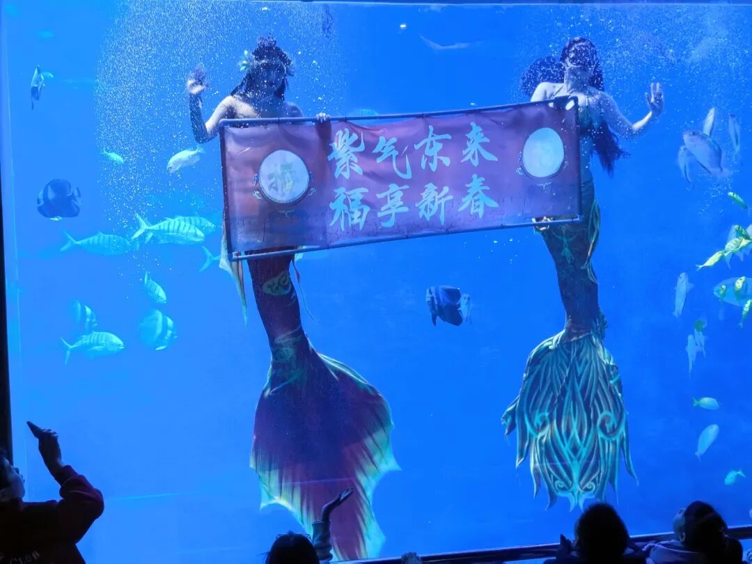 除了企鹅送福,升级后的美人鱼水下表演也成为活动的一大亮点。在蔚蓝的海底隧道中,身着新春主题华服的美人鱼表演者手持春联,与成群的热带鱼共舞,灵动的舞姿搭配喜庆的道具,让在场游客纷纷举起手机记录这一浪漫瞬间。“太惊艳了!平时看美人鱼表演就觉得很美,春节主题的表演更是多了一份年味,感觉像是在海底看了一场新春晚会。”游客李女士兴奋地说道。