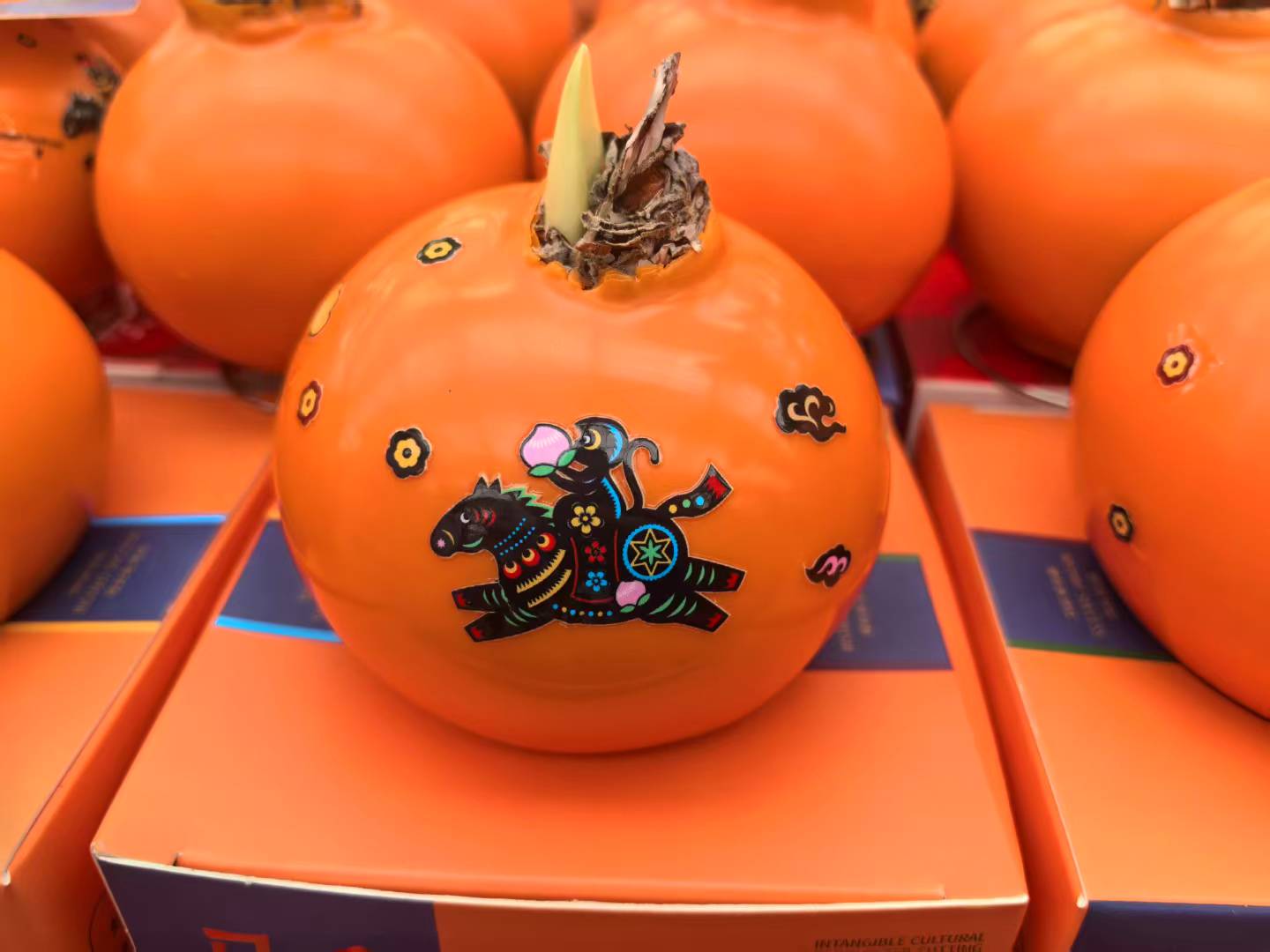 不远处,朱顶红摊位前同样热闹。摊主周超拿起一个贴着陕西非遗剪纸图案的朱顶红蜡球:“朱顶红谐音‘注定红’,配上剪纸图案,这款今年卖得最好。”