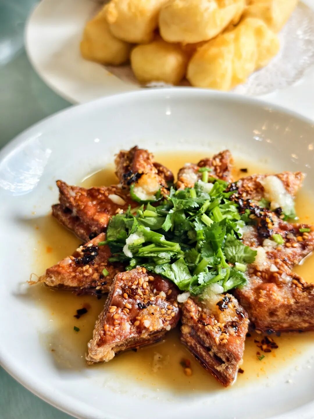 如果说前两道硬菜需要找个机会坐进店里慢品,那第三道“马识途·山河味”——穿越山河的风味联名臭豆腐烤馕,则是在帕米尔食府外卖窗口就能买到,还是店里自研的创意菜。新疆厨师从揉面团开始,在后厨的馕坑烤馕。将新鲜出炉的烤馕切成菱形块,两块一组,中间加王致和臭豆腐,外裹蛋液炸制。炸到外酥里嫩,放进清亮的蒸鸡汤,再撒上香菜和调味就可以吃了。正在外卖窗口排队的老饕告诉记者:“炸烤馕不像炸馒头片那么吸油,好吃还相对低脂,价格也实惠,有时候我一天来两回,就是馋这口。”