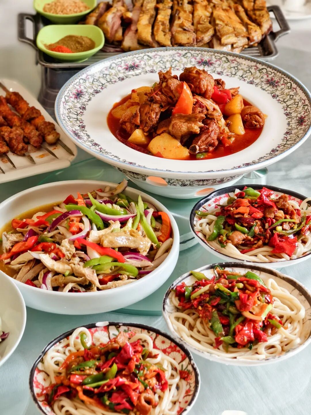 “骏马奔腾大盘鸡”则将经典大盘鸡赋予动感,寓意风味在口中奔腾。它主要用鸡块、土豆块和辣椒先炒后炖。做好后,皮焦肉烂的鲜美鸡块夹杂着青椒、红椒鲜亮的色彩,混合在汤汁中的土豆淀粉吸收了油腻,用筷子夹起宽且薄的面片在汤汁中搅拌几下,立刻被稠密的汤汁包围,放到嘴里麻辣鲜香,诸般滋味涌上舌尖。