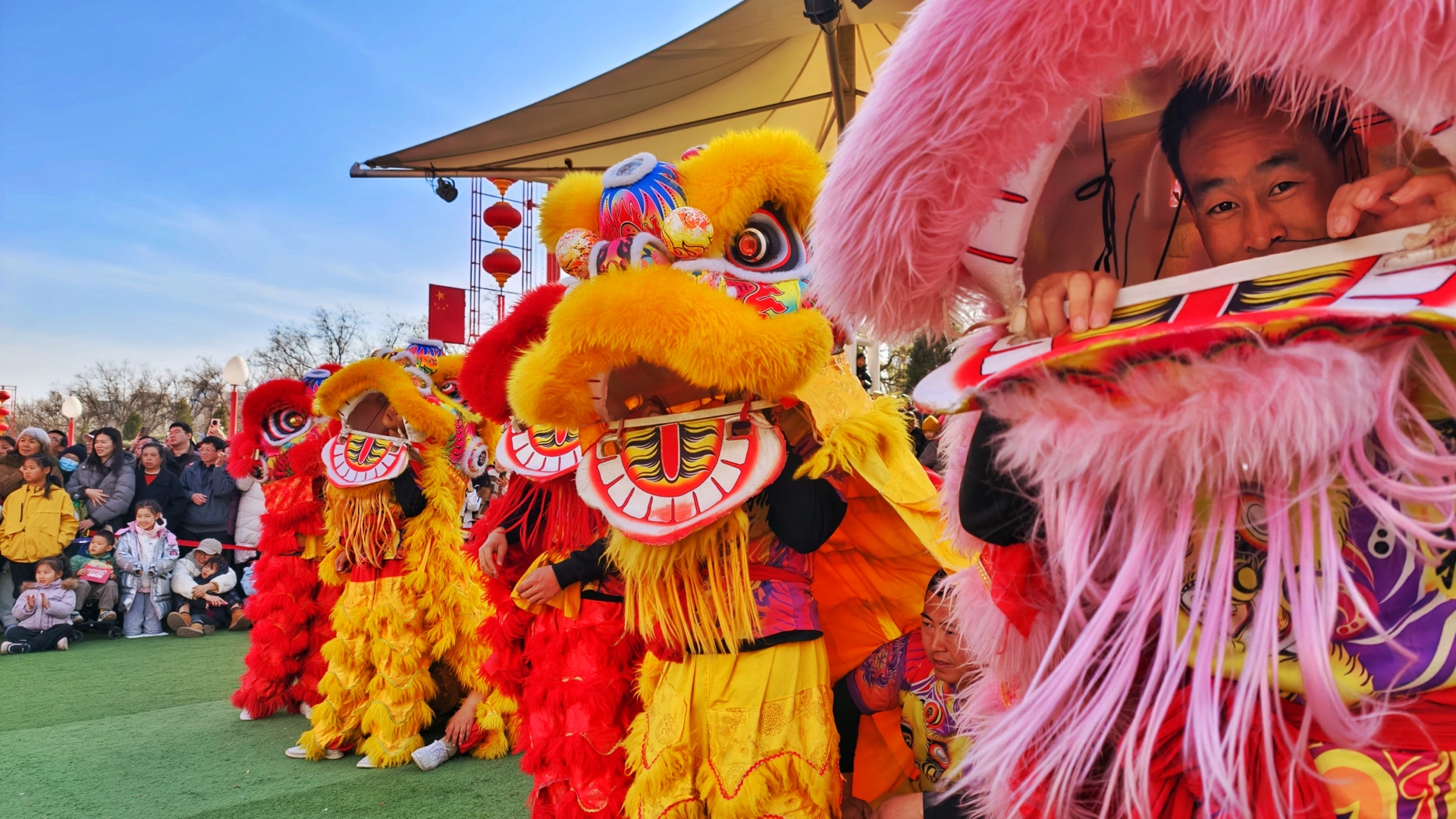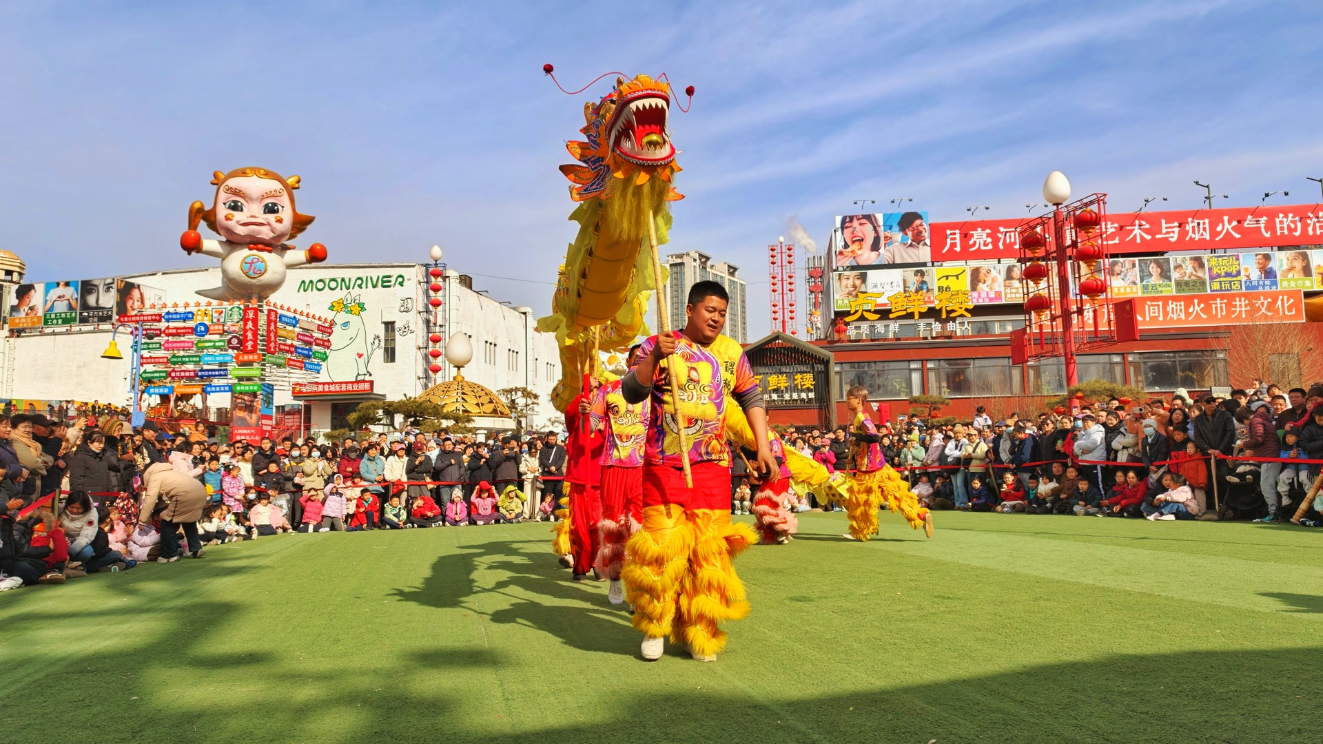 大年初七,通州区月亮河市集,舞龙、舞狮、中幡……精彩上演,红绸翻飞如流霞,人群潮涌成浪。