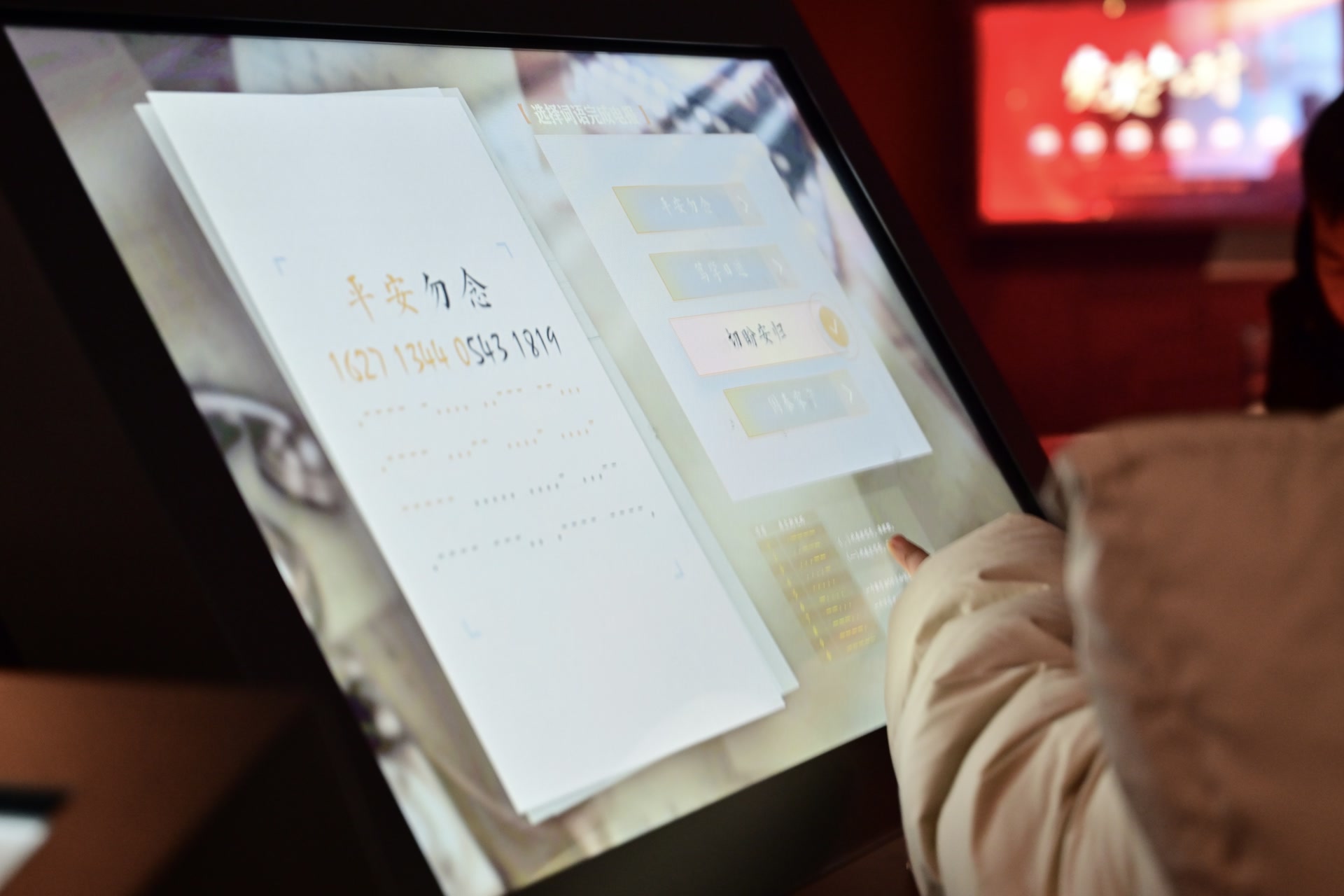 “久疏华盼,时启光尘。昨奉惠书,不啻清风来故人也……”观众在屏幕上选择“致父母”“致朋友”“致老师”等身份卡,不同内容的家书即跃然纸上,“春寒料峭,善自珍重。”“即请著安”“敬颂时祺”等书信用语,以及信纸的纹样都可以自由定制。“虽然知道写法,但是今天发现近代家书的遣词造句、抬头、落款都有许多讲究。”来自吉林的观众陈雅希写了一封给朋友的信,“平时大家都是通过网络联系,而书信承载的意义还是不同的,希望用这封在博物馆里写的信作为一份特别的春节礼物,新年见字如面。”