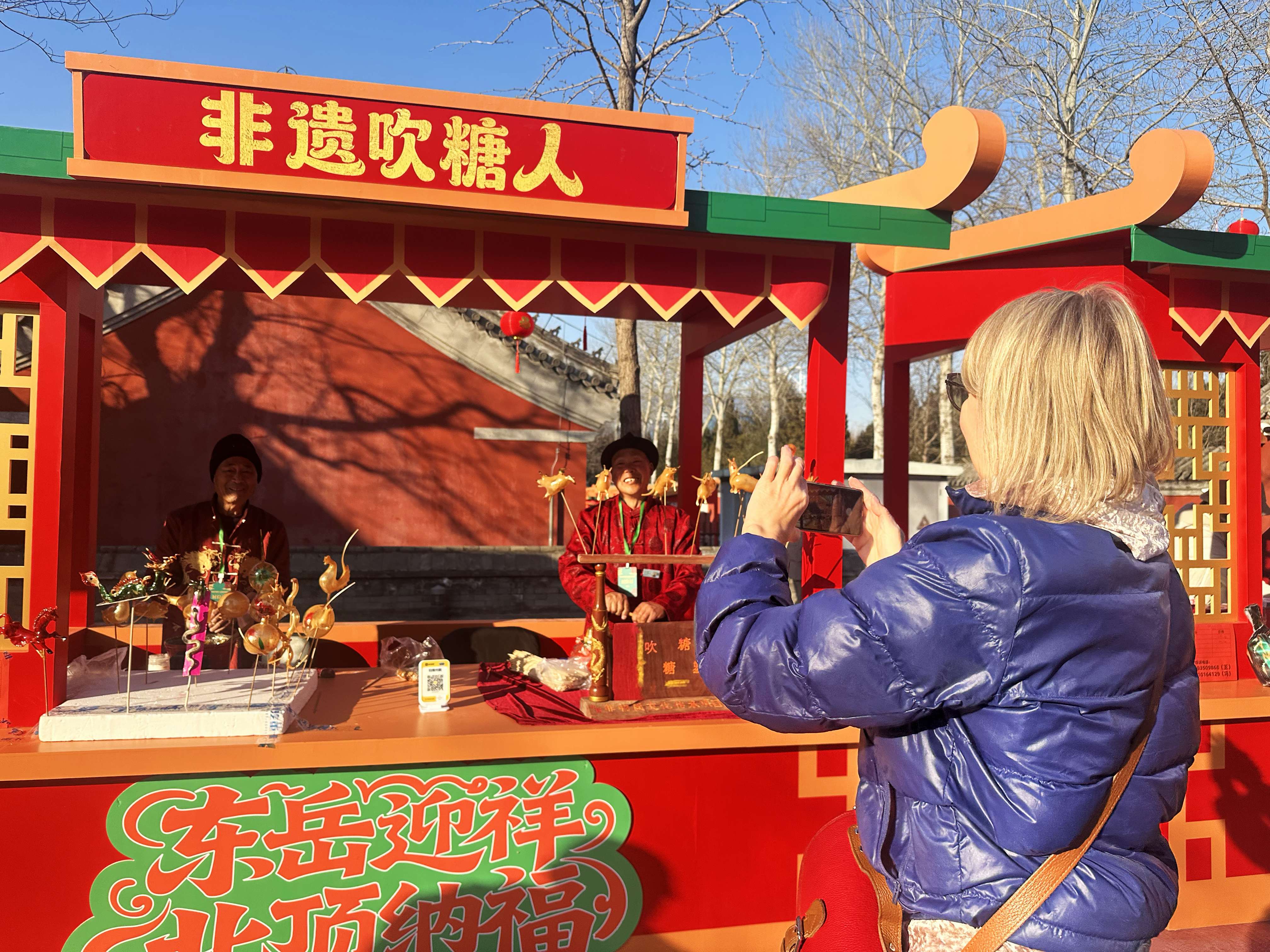 北京北顶娘娘庙内,俄罗斯游客斯韦特兰娜饶有兴致地观看糖人制作。“这是我第一次体验中国春节,非常热闹!我拍了很多照片。”她告诉记者,在颐和园、长城等地的游览经历也“令人难忘”。