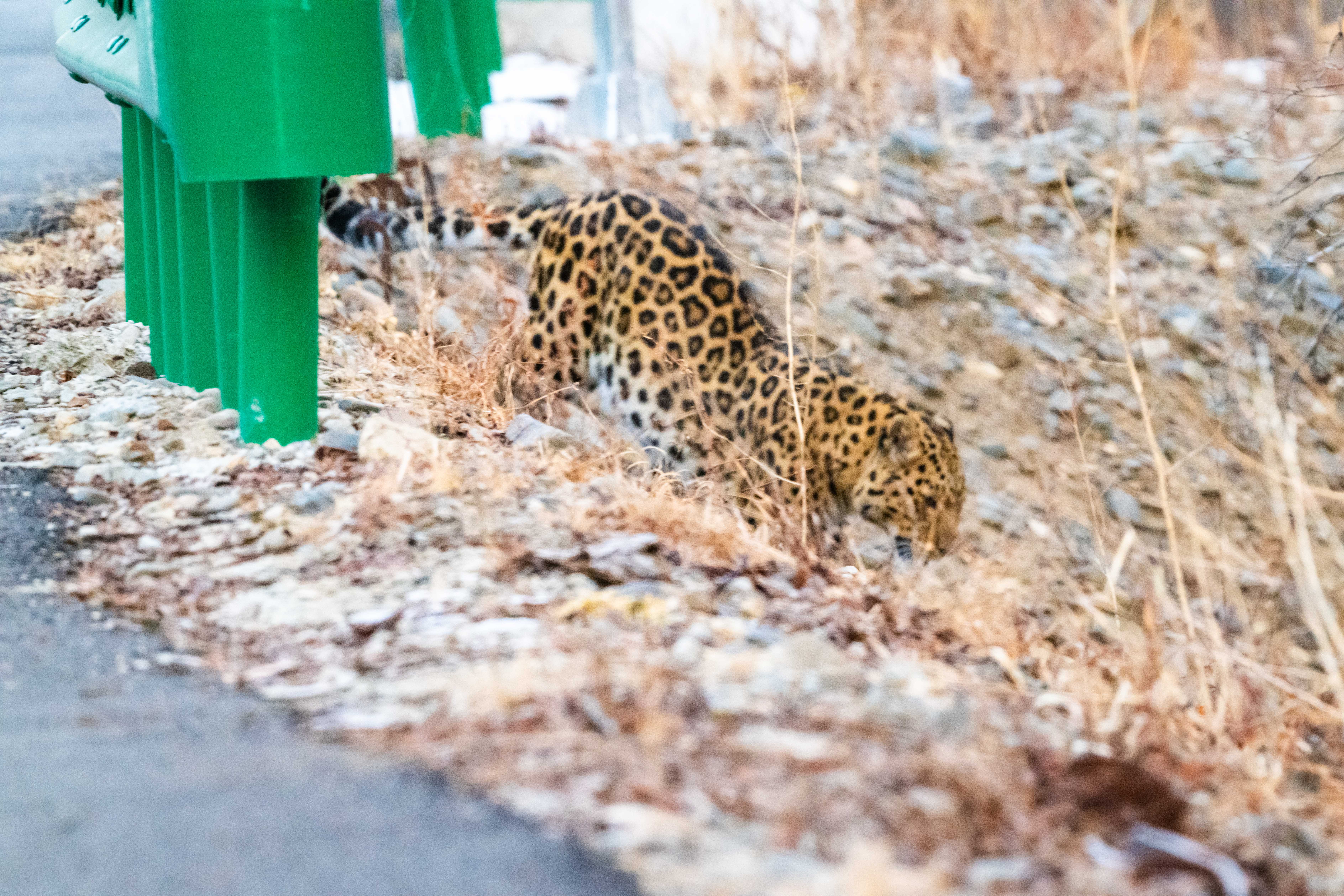 2月23日,吉林摄影师王莅翔在位于东北虎豹国家公园腹地的吉林省珲春市镇安岭村附近公路邂逅一只野生东北豹。据王莅翔介绍,这只东北豹从公路窜至山林后驻足回望,和他对视了数秒。