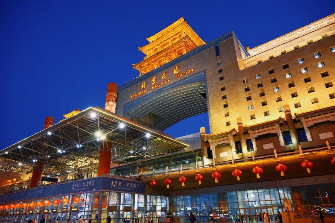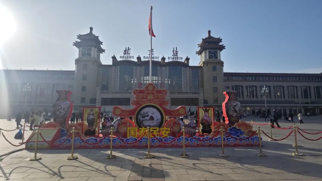 北京站广场前,宽达百米的灯光美陈将景泰蓝非遗元素与现代光影融合,成为抵京“第一眼的震撼”。