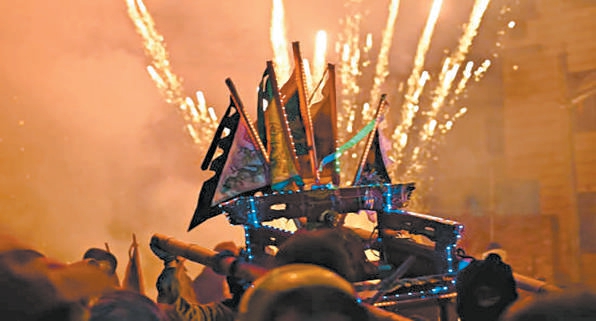 “三、二、一,起!”村宗祠前的空地早已围得水泄不通,嘹亮的号子盖过嘈杂人声。几乎同时,锣鼓齐鸣、鞭炮炸响、烟花蹿天,四周白烟缭绕,激得人张不开眼。
