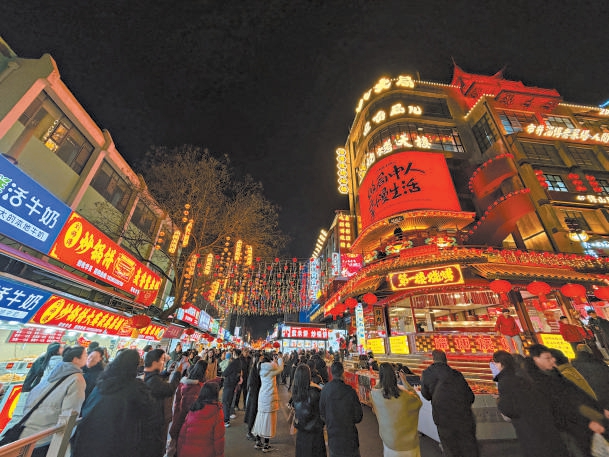 大年初二晚,我来到位于淄博市人民路的八大局北门,景区现场华灯璀璨,人流如织。路口把角处,去年新开业的“这有局儿”的七层建筑格外醒目,外立面上的大红色装饰年味十足。走进一层中庭,一株由千年琉璃工艺打造的“七宝琉璃树”十分吸睛——在AI算法驱动下,光影在琉璃叶片间流转变幻,裸眼3D特效让齐文化图腾跃然而出,古今交融的视觉冲击令人赞叹。