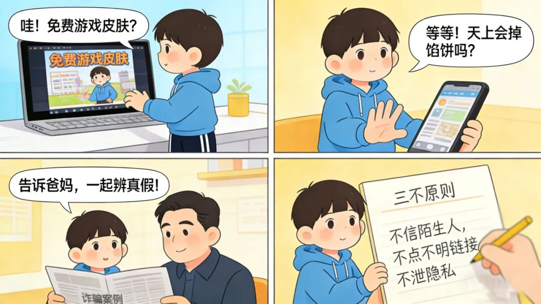 牢记“三不原则”:不轻信陌生人、不点不明链接、不泄隐私(密码/验证码/住址);